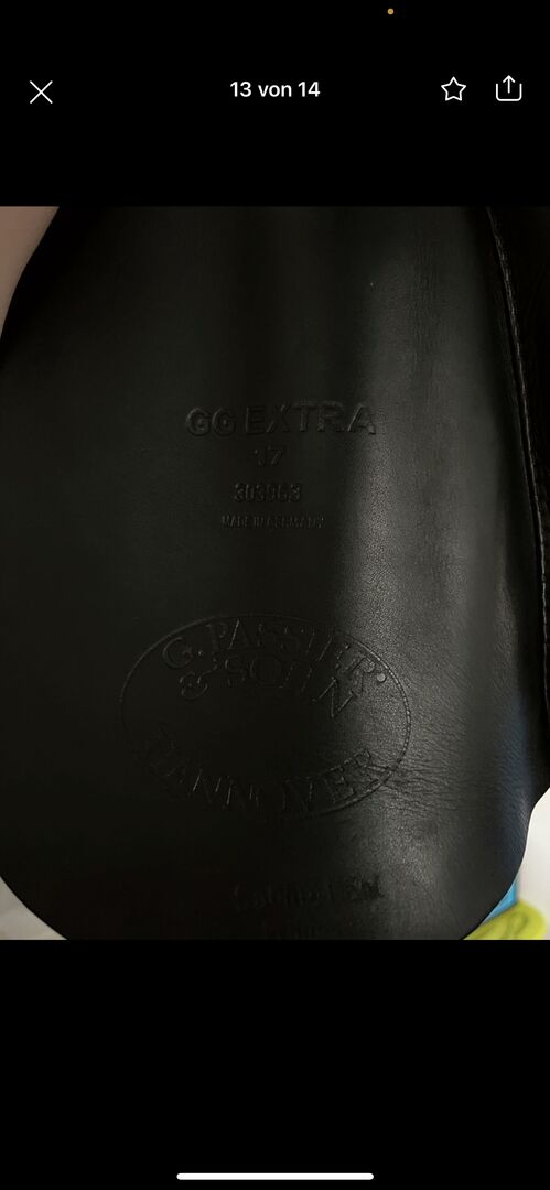 Passier Dressage Saddle GG Extra 17 inch - Sell here our dressage saddle brand Passier GG Extra in 17 inches, chamber width 30 , black. We bought in used 2 years ago. The front girth strap was pulled through the thimble, because our horse has a short back and the saddle would otherwise have slipped forward. However, this can be undone without any problems. The saddle was little used by us and very well maintained. Look at the pictures, the saddle is in perfect condition! Private sale, therefore no guarantee or return. Shipping would be possible, cost for this I would have to explore.