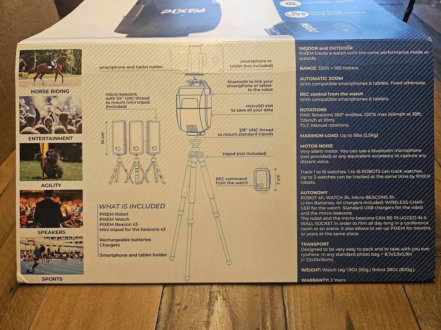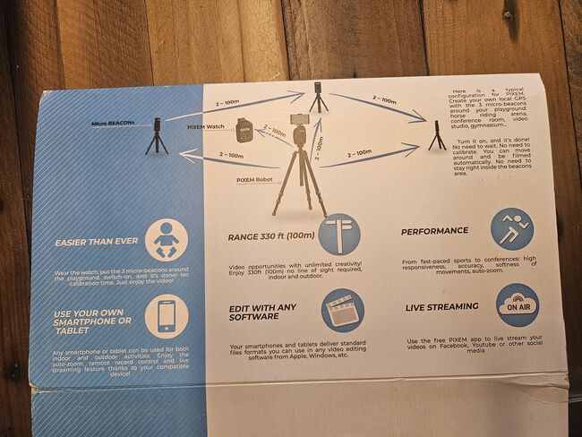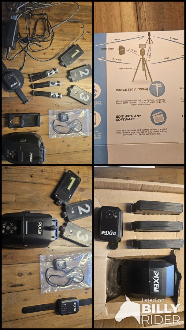 PIXEM automatically zooms and follows your movements in real time and is equally suitable for INDOOR & OUTDOOR. By wearing the watch, the Pixem always follows exactly and does not get confused by other riders / people / animals.