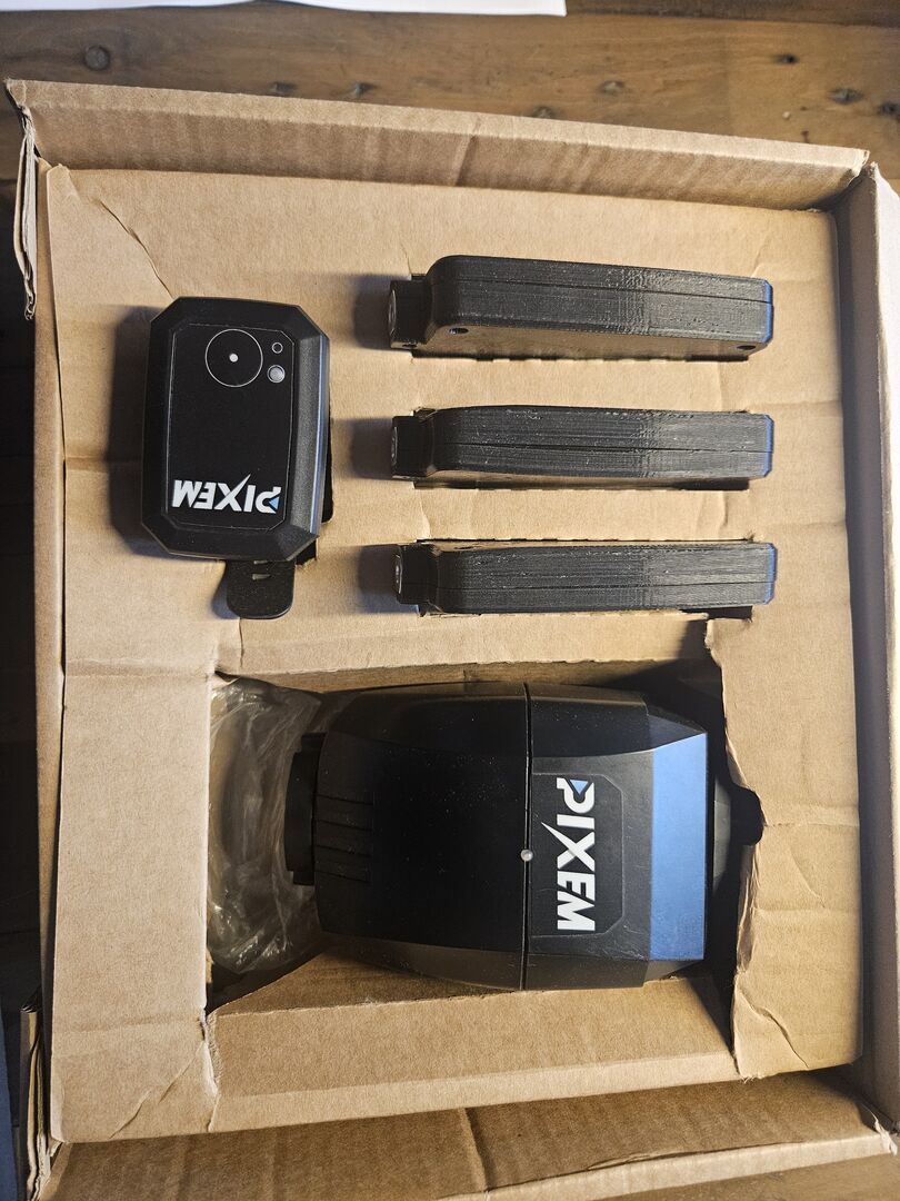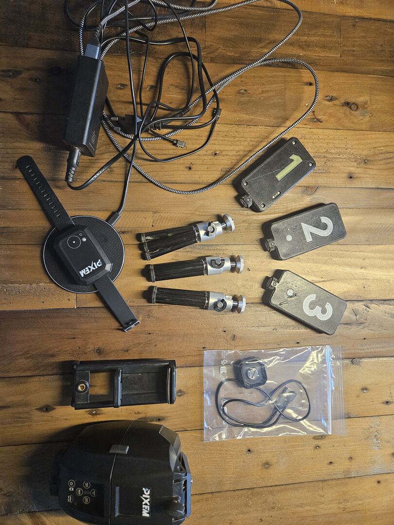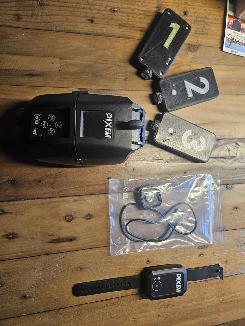 Included are: - 3 beacons incl. 3 tripods - Watch incl. inductive charging plate - Charging cable for the Pixem and the beacons - Distribution socket for easier charging