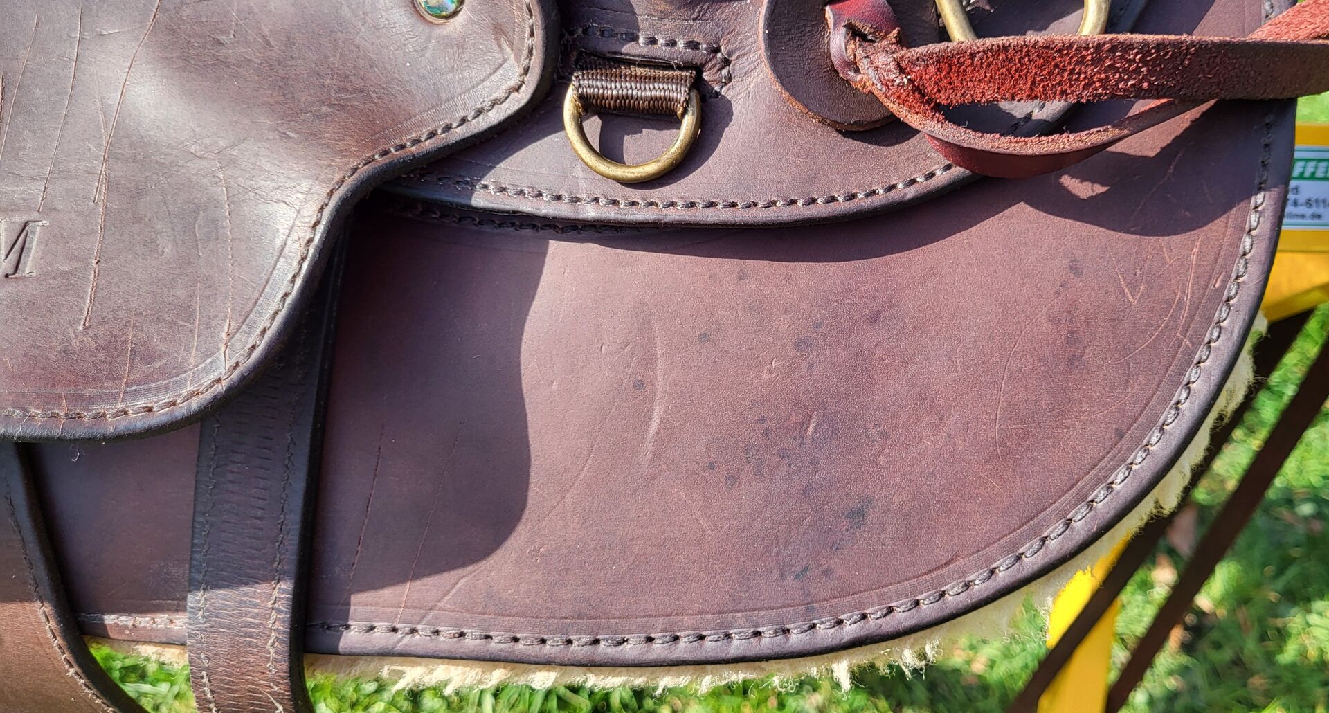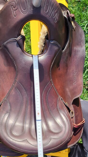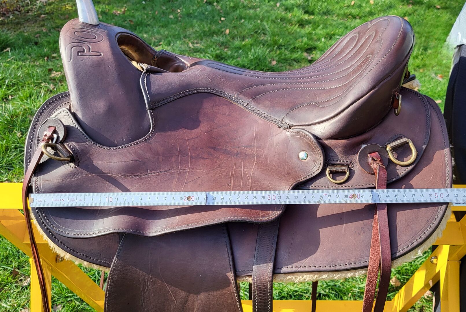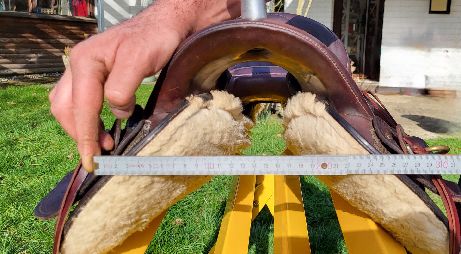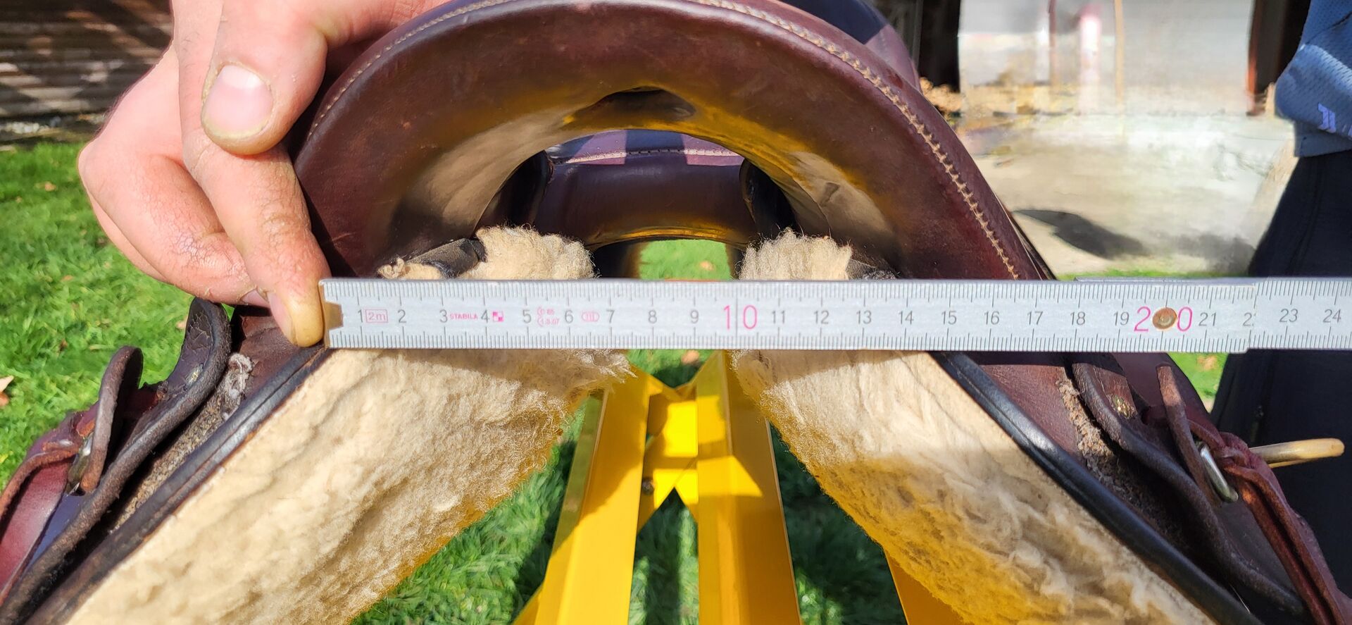 Please refer to the pictures for dimensions and condition. AND: The farm cat has unfortunately decided to use our saddle as a sleeping and playing area, please note the scratches!