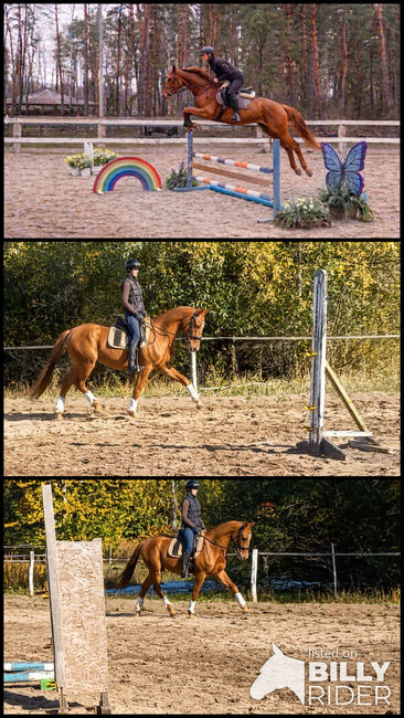 🐴 Ridden and cooperative.Does not look at any ditches, foundations, boards and other spooks. Currently jumped to 80 cm, in constant training. With potential for high sport, a great prospect for this year's Polish Young Horse Championships. Easy to ride- suitable for a child or amateur.