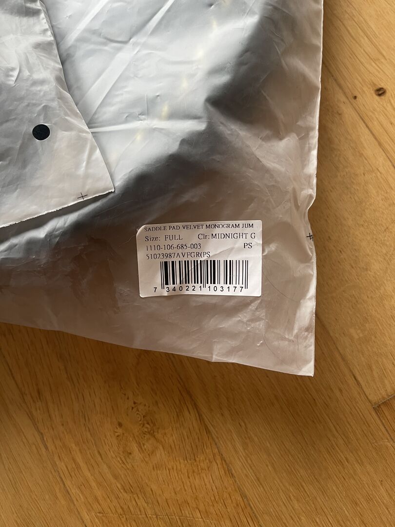 Twice used PS of Sweden Velvet Monogram Set in Midnight Green. Jumping saddle pad and fly hood. No defects. Saddle pad has only been brushed and not washed, so has a few hairs on it. But has not been ridden sweaty. NP 80€ saddle pad and 50€ fly hood.