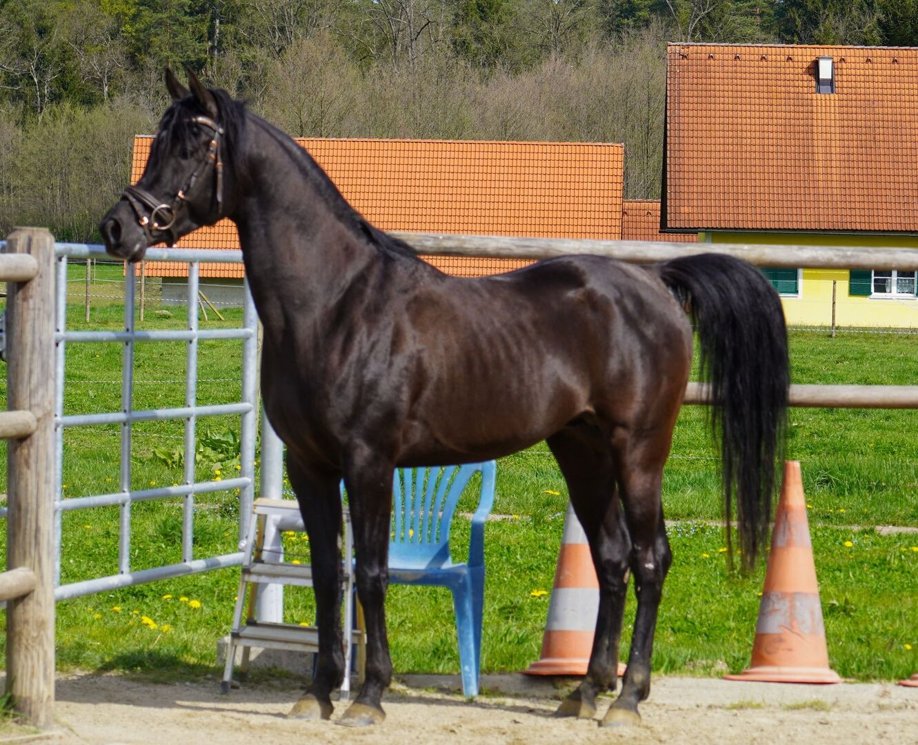 Purebred Arabian black stallion, pure Egyptian - 5-year-old Egyptian black stallion without markings for sale. He has grown up with us in a species-appropriate manner and has spent the last few summers on alpine pastures among stallions. He is currently in training. His character is very reserved towards strangers, but once he has gained confidence, he will do anything. He is currently in training, which is difficult at the moment due to his hormones. Will only be given to people who know this special breed. Due to his pedigree and correct conformation, he would also be suitable for breeding, otherwise it would be better for him and his future owner to keep him as a gelding. As we have some half-sisters of his, a swap for a black stallion of foreign blood would also be conceivable.