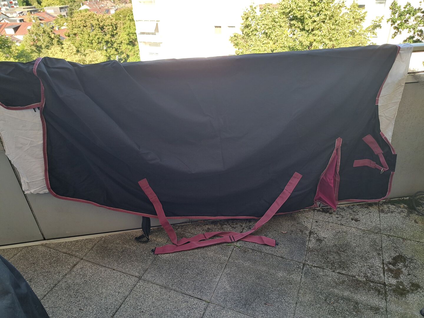 Rain rug, highneck, 165cm, 0g, black/pink, Horsegear - I offer a rain rug Highneck in 165cm with 0g filling in the color black/pink from Horsegear.