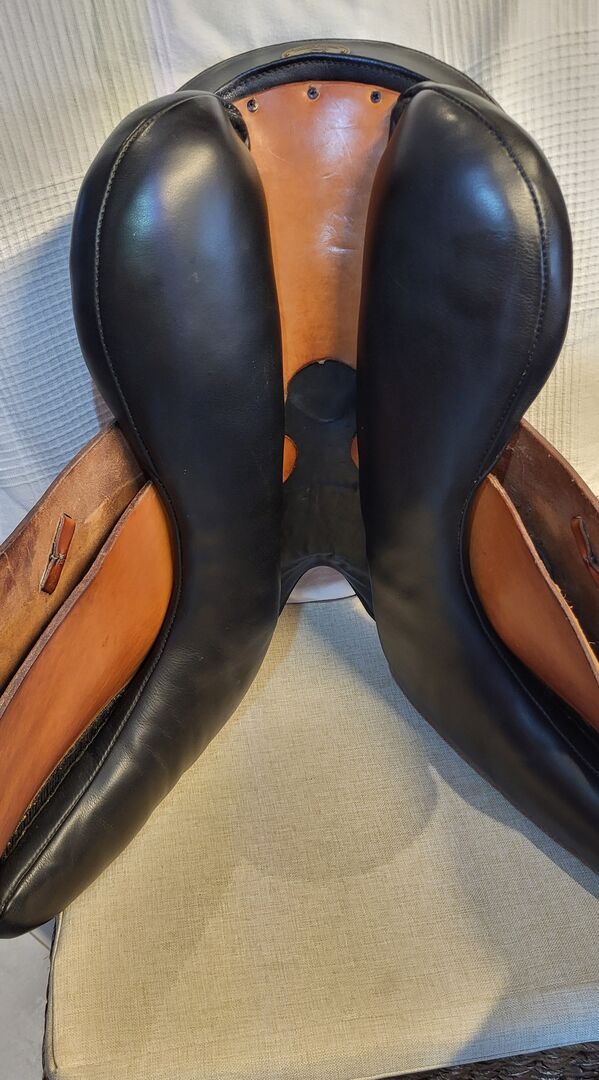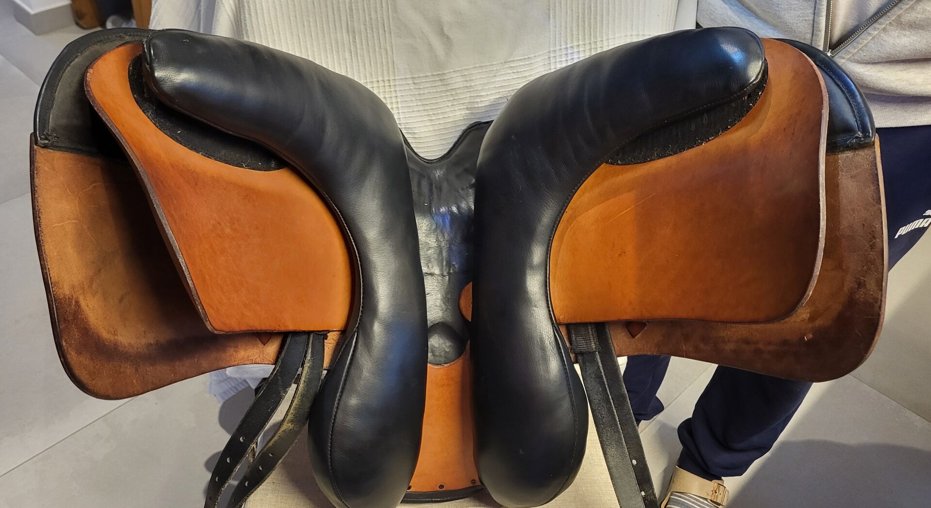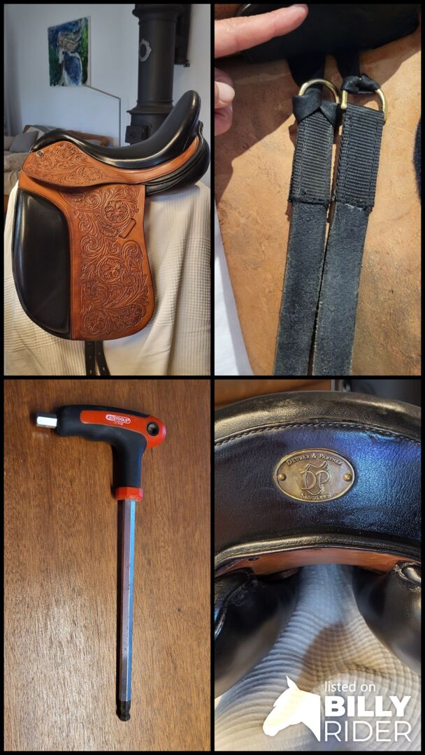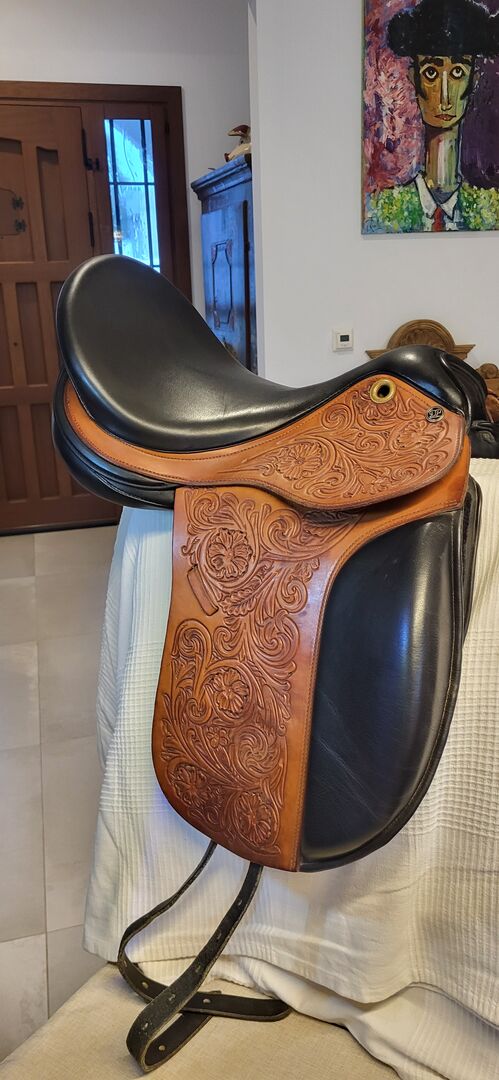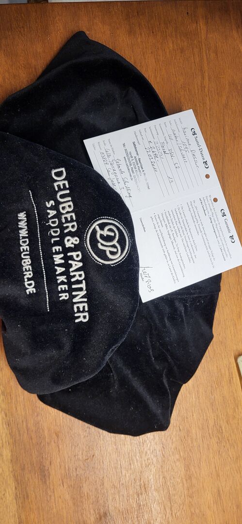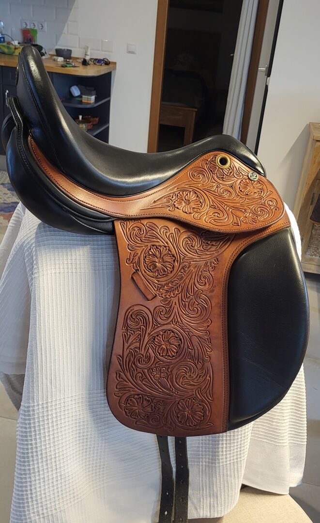 Rarity: Beautiful saddle Maxima Flora by Deuber - I am selling my beautiful Maxima Flora saddle by Deuber &Partner. The saddle with its floral leather punching is truly exceptional and very rare. A real eye-catcher. I immediately fell in love with the saddle. Not only because it is so beautiful, but also because it is very versatile thanks to its many innovative functions. The saddle tree is flexible and the chamber width can be individually adjusted using an Allen key. The original imbus key is included. The saddle is very light (approx. 7 kg) and the contact surface of the saddle panels on the horse's back is very short, with a slight curve. Ideal for Iberian horses, for example. The saddle has 2 flaps, but can also be used as a mono flap. The sweat flap can be removed by loosening a screw. I have used it as a dressage saddle. But the position of the saddle flap can also be moved to the front so that the saddle has more of an eventing shape. The girth straps are long and were replaced a few years ago. They are in good condition. They are easy to replace (see photo). There is also an additional eyelet for a girth strap, but I have never used it. The stirrups (not included) can be placed over or under the saddle flap. The latter is recommended so as not to wear out the leather markings. The seat size is S2 = medium size approx. 17 -17.5 inches The saddle padding is soft. I have always used the saddle with a lamb rug. I am selling the saddle cover from Deuber with it. Saddle flap is available I have only used the saddle a little and it is in very good condition. I haven't used it at all in the last few years as my horse is now 26 years old and I no longer ride him. But somehow I never wanted to part with the saddle. But it doesn't get any better from lying around and maybe I'll find someone here who will be delighted with this beautiful piece. This is a private sale. I offer no guarantee or warranty and exchanges are excluded.