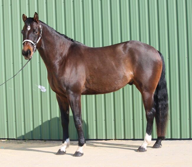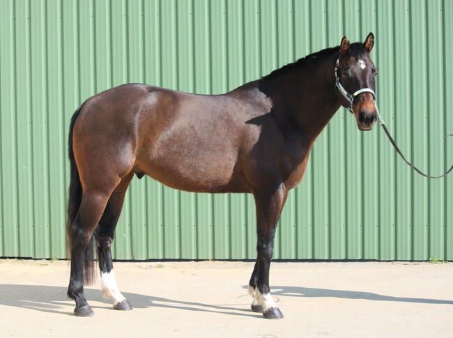 AM Ultimate Aint (Schoko) is a beautiful Quarter Horse gelding, born in April 2019, with a height of approx. 167 cm. This large-framed gelding impresses with his correct conformation and very compact, harmonious proportions. He has AQHA papers and an equine passport and has a very good all-round pedigree (Aint It The Blues x The Ultimate Fancy). The gelding is barehoofed, has regular dental check-ups and is under osteopathic care. He is reliably vaccinated and wormed. Due to his growth, he was broken in late and gently and trained in a variety of ways. Schoko is familiar with lungeing, double lungeing, work on a cavesson and ground work with a halter and work rope. He is also trained in calmness training and balance training. In the field, the gelding is well-behaved in the group and is also experienced as a hand horse. He is familiar with everyday situations such as cars, tractors, dogs, children and much more. His gaits are very pleasant and soft to sit. His character is that of a sensitive, people-oriented and friendly gelding who appreciates contact with people and likes to be cuddled. Schoko is easy to handle, willing to learn and always eager to please his rider. At the same time, he has a certain sensitivity and is a bit jumpy, which is why he needs a person who can give him confidence and work with him consistently but calmly. He responds particularly well to signal word work. He knows both open stable and box stabling, is well tolerated in the herd and is reliable at the farrier and when being loaded. In terms of his health, it should be mentioned that he suffers from summer eczema due to a pollen allergy, which can be managed well with appropriate care and management. He also had a tendon sheath opening on his hindquarters as a result of an accident, but this has healed completely without complications. Veterinary and clinic reports are of course available for inspection. There are no findings on the front leg. Under an experienced rider who continues to train and encourage him with calm, clarity and consistency, he will develop into a great and versatile partner. He is suitable for ambitious leisure riding as well as for all-round competition and is also interesting for hunter classes. To the seller's offerlaunch