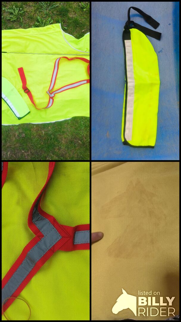 There is no damage to any of the items. The Velcro fasteners on the rug and tail flap hold as you would wish. The only flaw: I couldn't get the rug spotless despite a round in the washing machine, as the neon yellow is quite a sensitive color. In addition, there used to be a reflective horse's head on one side of the back of the rug, which has since come off but is still vaguely visible (last photo).