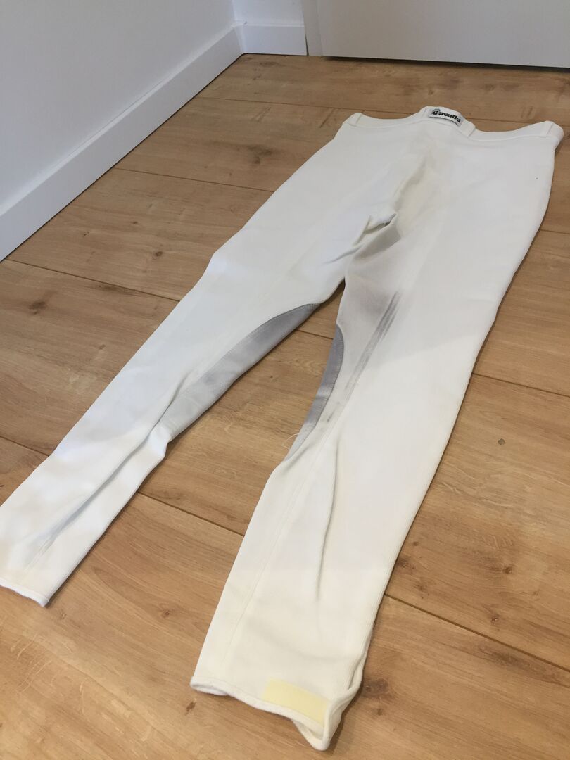 Riding breeches white size 182 - Breeches were worn only 3 times and that on a fox hunt, hence the slight mud splashes in the crotch, it also has discoloration from the leather, which you can see in the pictures. With a little skill you get the stains determined out.