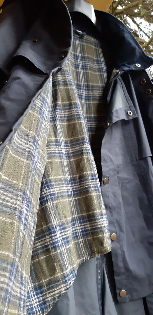 Riding raincoat - Riding raincoat with detachable hood in size XS, made of waxed linen, dark blue, 2 outside patch pockets, 1 inside pocket with Velcro fastener, 2 leg loops.
