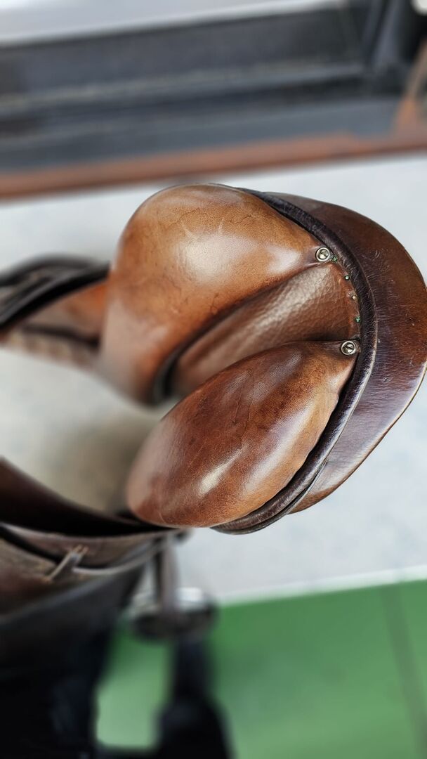 Riding saddle Röösli - Röösli saddle from an inheritance. Due to the construction I assume that it is a dressage saddle. The saddle has been kept dry and is in good condition. (see pictures). Complete with stirrups and stirrup leathers.