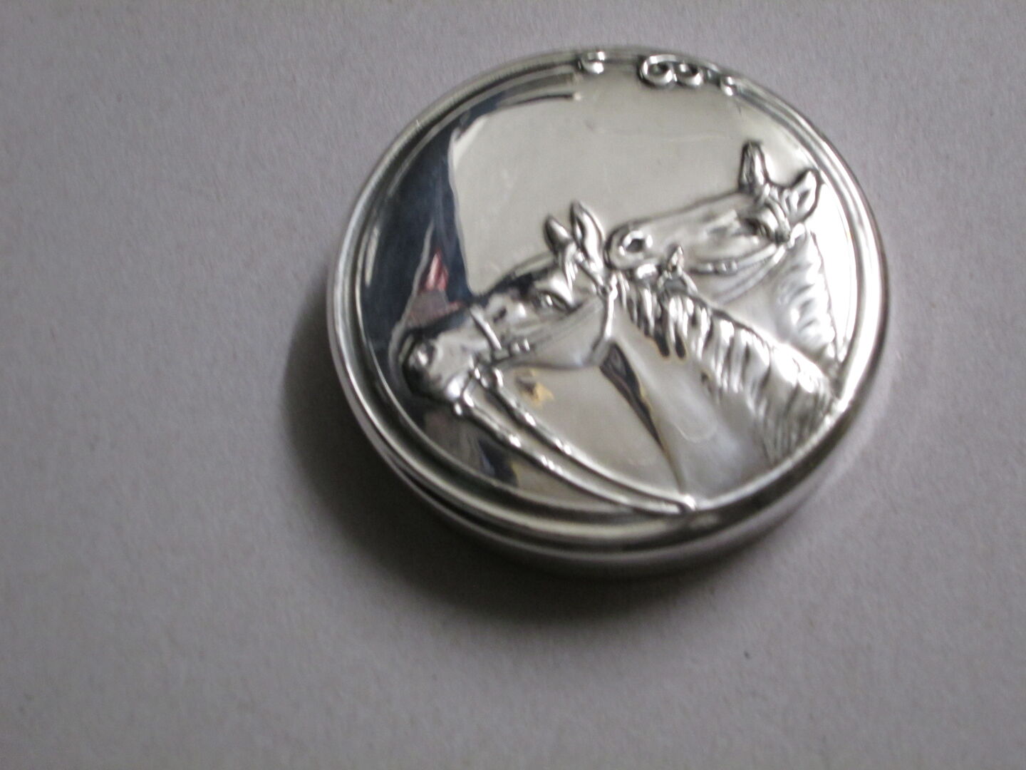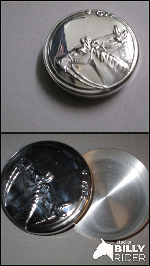 Round silver-plated box with 2 horse heads 7 cm - Silver-plated box (silver-plated brass) with lid Diameter 7 cm, 1.5 cm high 2 horse heads from Portugal