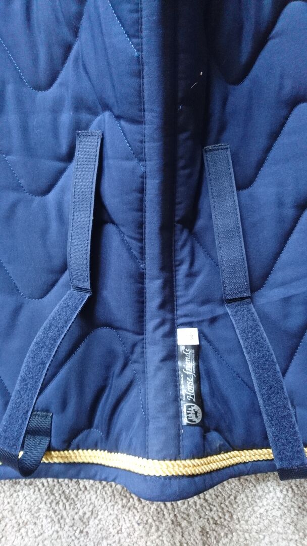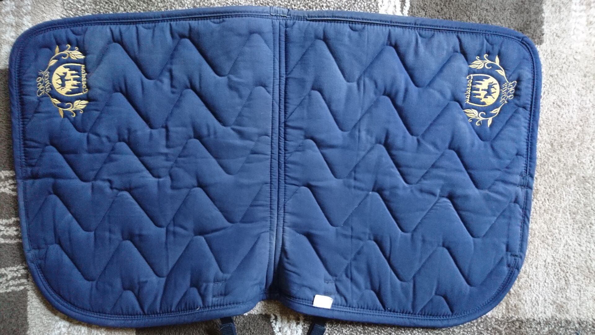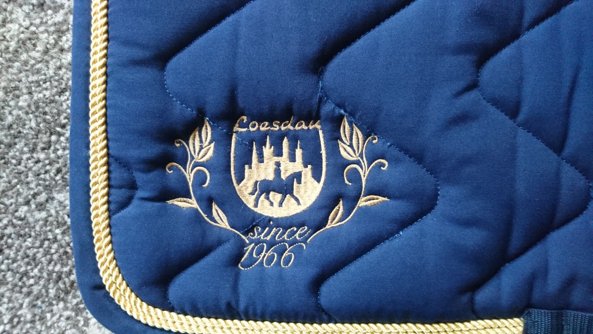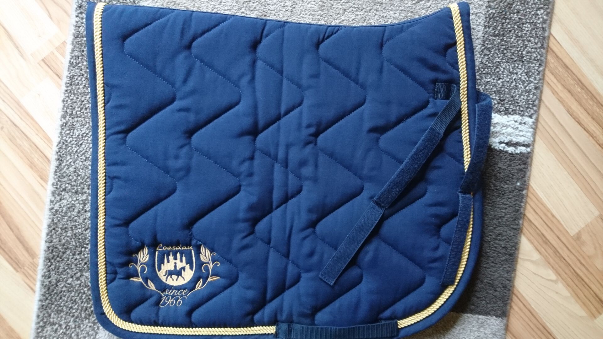 Measurements and details: - Dressage: approx. 60 cm x 54 cm - double cord piping gold on both sides - very nice and elaborate embroidery logo - cord loops can be varied by velcro fastening - upper and lower material: 65 % polyester, 35 % cotton, filling: 100 % polyester - washable up to 30°C