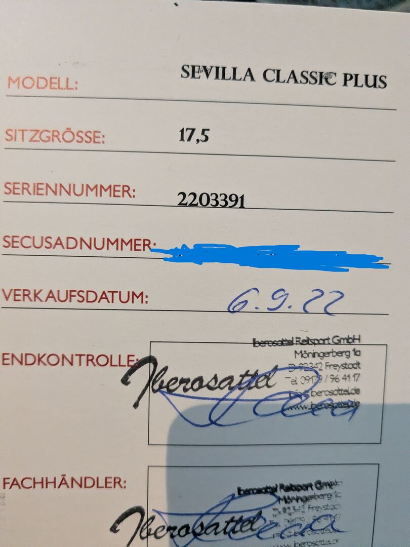 Saddle Sevilla Classic 17,5 Ibero saddle - I am selling our Iberosattel "Sevilla Classic", which I bought NEW from Iberosattel in 2022. The saddle has slight signs of use (see photos), which are not visible on the outside except for two very small scratches, Seat size: 17.5 Seat shape: Deep seat Chamber width: 32 Pommels are removable with Velcro NP 3.350 Euro The saddle can be borrowed for a trial period for a deposit Shipping possible with purchase!