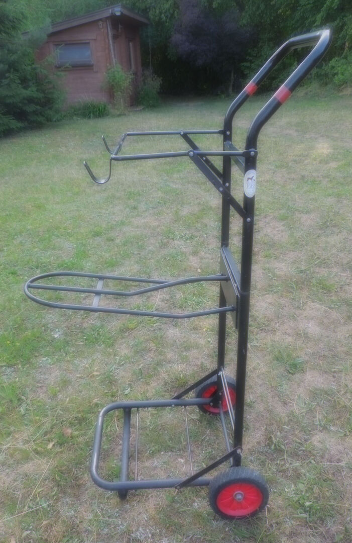 Saddle wagon Caddy used - Sell used tack wagon. Ideal for stables with long distances between tack room and grooming area. The saddle cart offers enough space for saddle bridle, halter, grooming box, accessories. The saddle cart has traces of use that do not affect the function. NP 95,-€