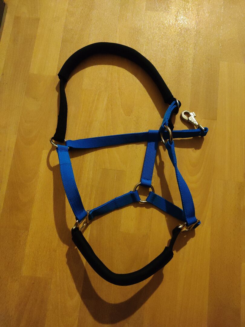 Safety halter Kavalastic in light blue W/L - 3x used safety halter with elastic inserts in the nose and neck area, washed, L/warmblood, to give away, because it rubs off the fur of my mare's face in 2 places, my friend has the same halter in VB and with her everything is great, advantage: when "playing" on the paddock, the halter slips off the head, before injuries can occur in the head/neck area.