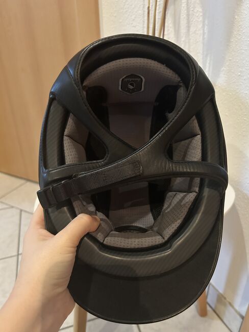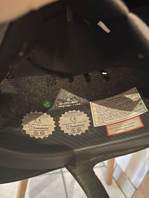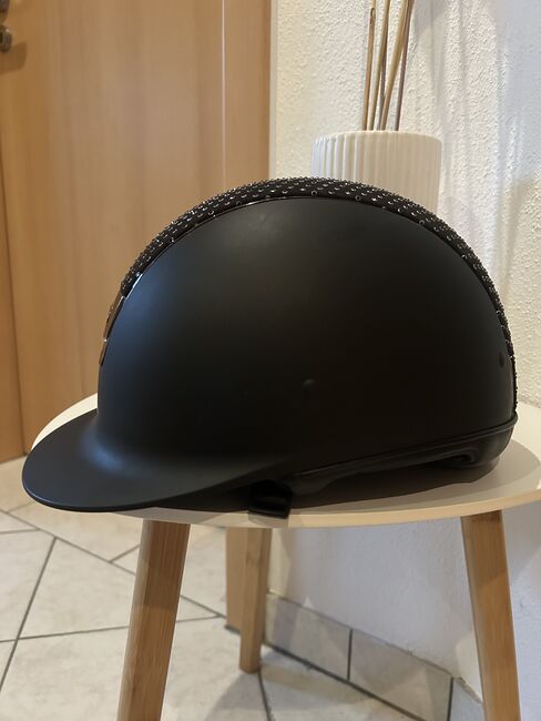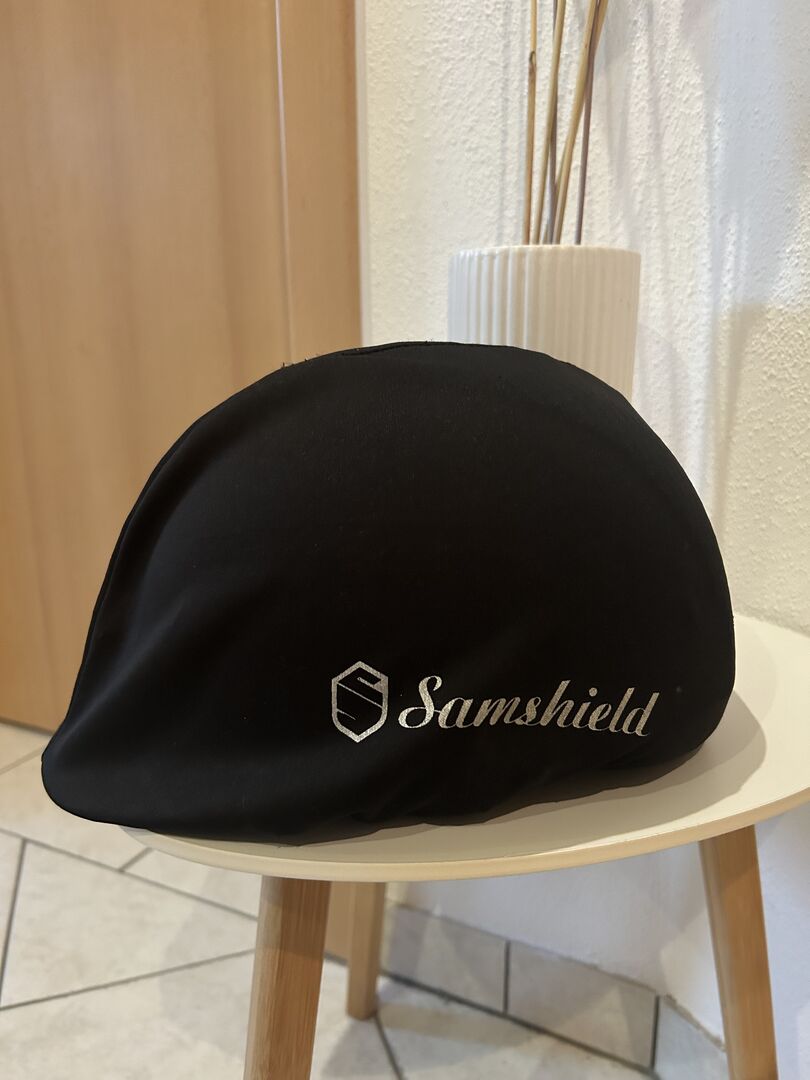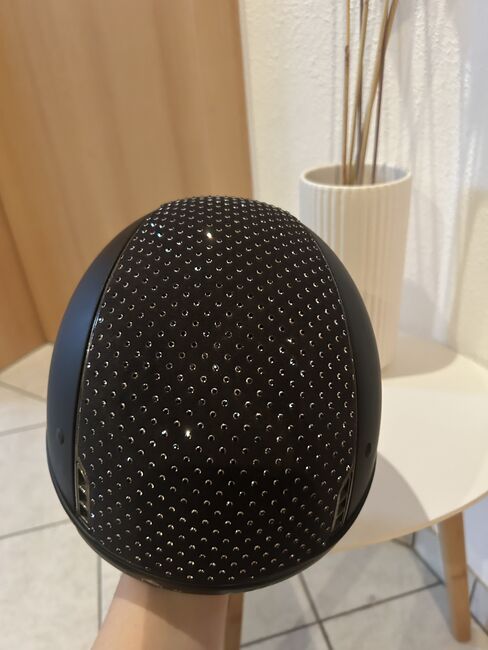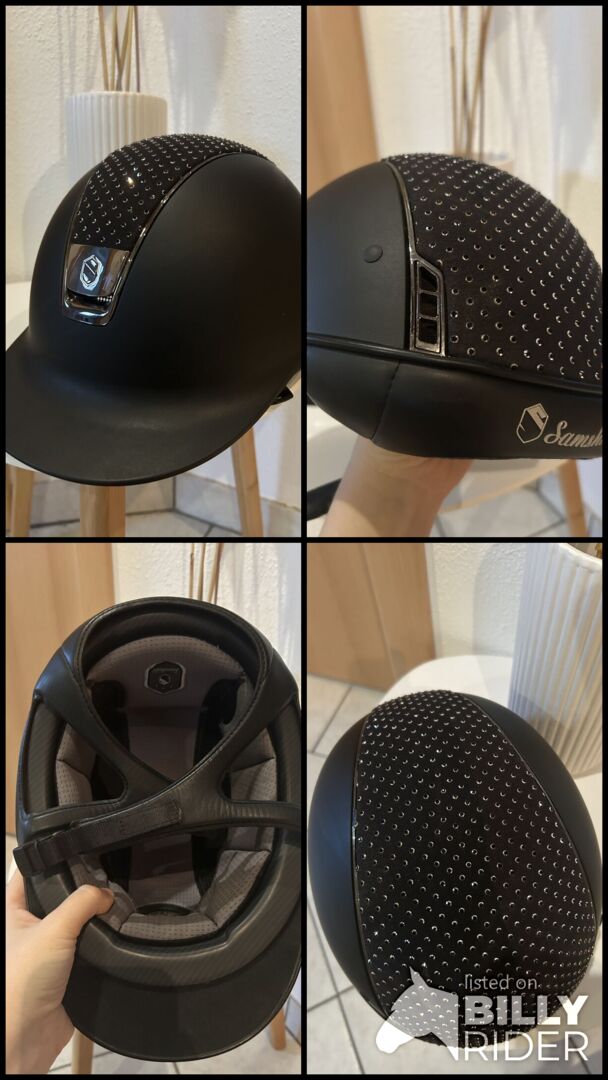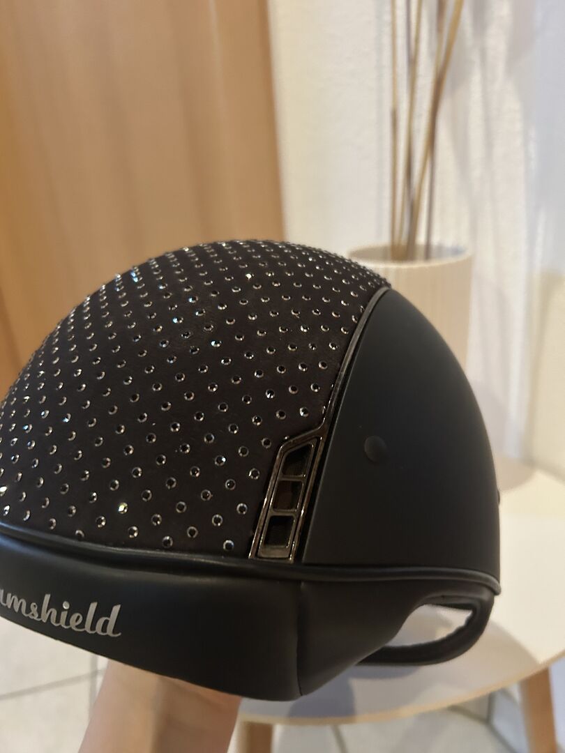 Samshield riding helmet M black Swarovski, glitter, as good as new - I am offering for sale my as new Samshield riding helmet with the M shell. I am also including the original dust bag and inlay in size (57). The inlays can be exchanged and washed depending on the head size. I have worn the helmet once at the tournament so it is crash-free. It also has no scratches or discoloration. The blusson is in "crome black" and topcoat is "raindrops Swarovski black, Silver"