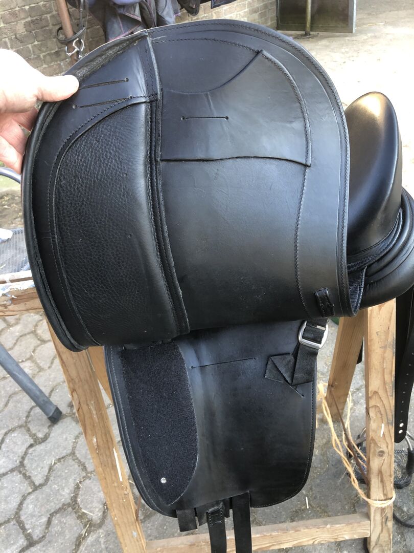 Only for sale due to change to eventing saddle. I bought it new, the mare was broken in with it and her back and ballance have developed magnificently. It was checked every six months. It is filled with good quality sheep's wool, and the point of the stirrup bars is shaped to the rear for better adjustment of the shoulder angle. Enormous shoulder freedom and a very comfortable saddle when I unloaded him from the trailer. See last picture as it has a mini mini quirk. Price is negotiable