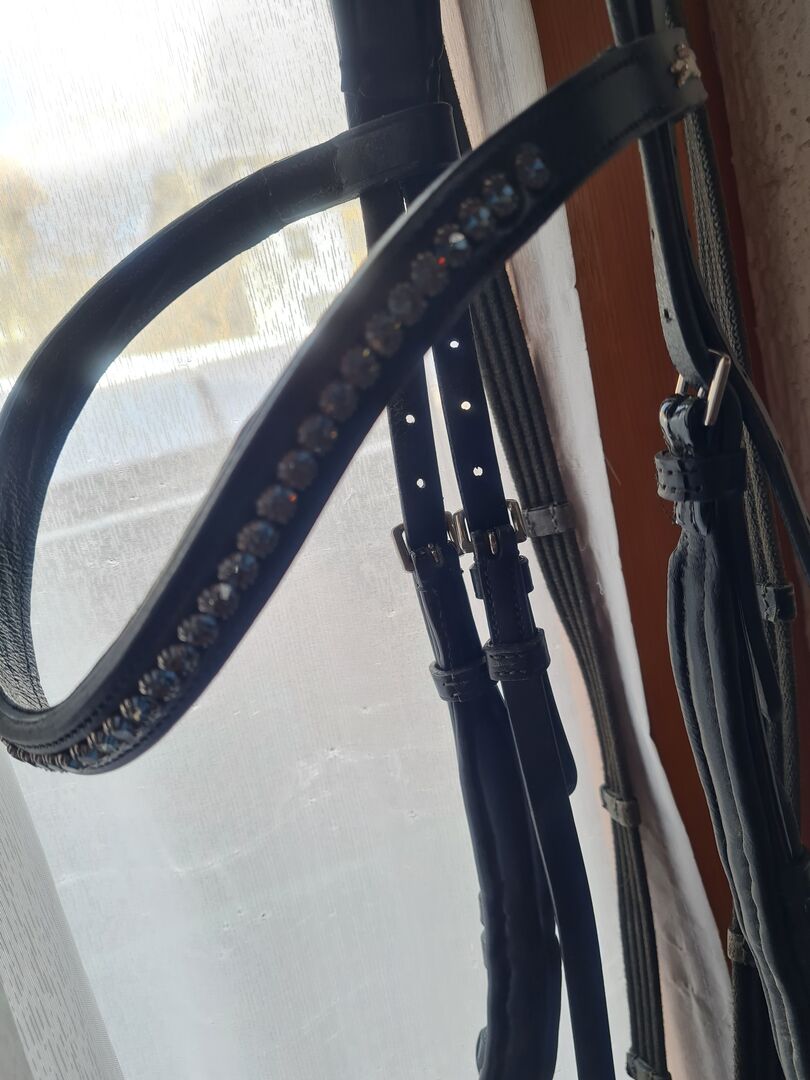 Schockemöhle Sports snaffle EQUITUS BETA XL-WB patentgrey/silver patent - Snaffle as new, hardly used. (NP Eur 319,00 without reins). VK Eur 250.00 including reins. Elegant anatomical special snaffle with new fit from Schockemöhle Sports. Curved noseband bypasses the main facial nerve. Softly padded headpiece with plenty of ear clearance. Curved browband decorated with large crystal chain with extra-wide fit to avoid pressure in the eye-ear area. Free breathing due to repositioned locking strap, Button rivets for individual adjustment. Further questions gladly by mail.