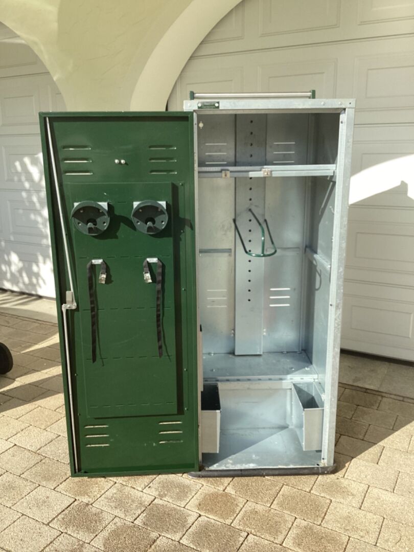 Sellaport Mobile Saddle Cabinet - Mobile saddle cabinet/turnout cart from Sellaport made of aluminum, good condition, lockable, offers ample storage space and numerous adjustable compartments & holders, see pictures.