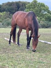 Idola is a bay German riding horse mare born in 2019 with a height of approx. 157 cm. She is pretty, compactly built and healthy. Idola's character is very sensitive and people-oriented, a little timid, but always well-behaved and loves children. Due to a hormonal problem, she sometimes shows increased sensitivity during heat. In the past, she had a paddock accident with a flesh wound, which has healed completely and no longer causes any problems. Idola is used to being kept in a stall, in the pasture and in an open stable in summer and is used to being kept in a herd. She is well-behaved at the farrier and vet, but needs a little persuasion when being loaded. The mare is broken in, knows trotting poles and small jumps, is very willing to learn ground work and also goes off-road. She is still very tense under saddle and needs a calm, confident rider who can instill confidence and security in her. Idola is willing to learn and wants to develop further, but needs time and patience to do so. The mare is not a beginner's horse and is looking for an experienced person, ideally with experience in dealing with sensitive horses or thoroughbreds. As she and her current rider are not compatible, she will only be passed on to good, experienced hands. Once she has found her owner, she will develop into a great partner horse. To the seller's offerlaunch