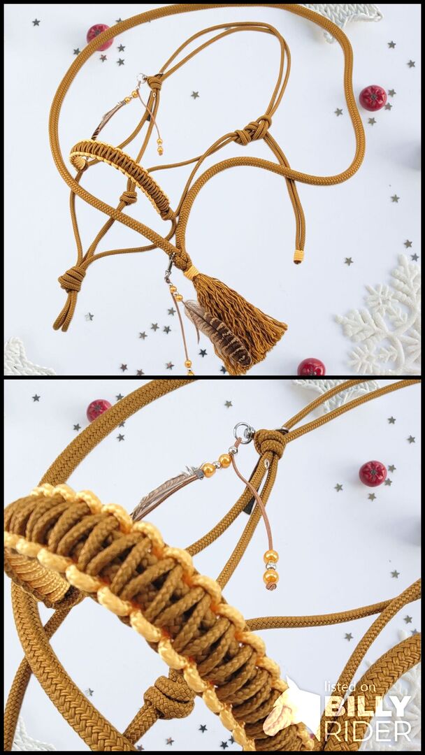 Set in caramel and gold knotted halter and neck rope COB - Beautiful handmade set Set consisting of a knotted halter with knotted nosepiece in 2 colors. The nosepiece is knotted with gold. Comes with a feather clip with gold-colored beads and a neck rope with tassel and feather clip. Halter 6 mm thick, rope 12 mm thick with leather flap