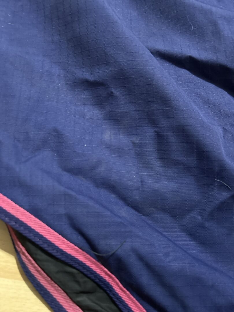 See pictures for manure stains which unfortunately no longer come out. But you can't see them as much as in the pictures because the blanket is darker.