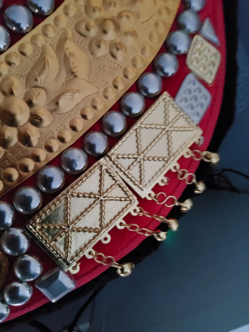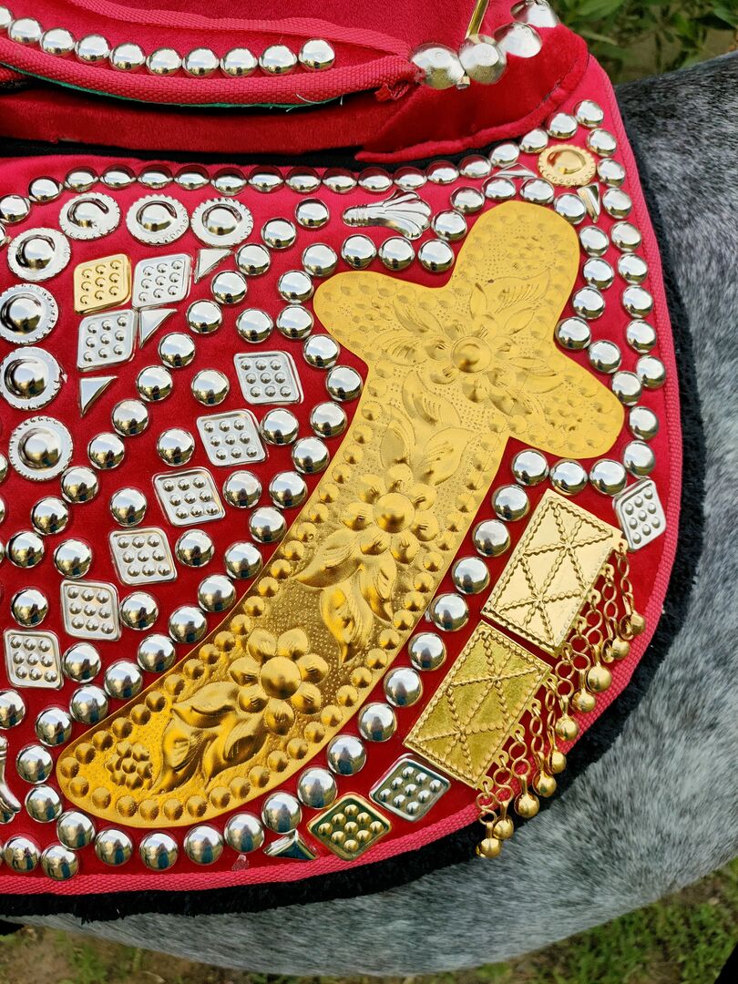 The contact surface on the horse is soft, padded and perfectly fits the horse's back. The saddle and accessories are handmade and accordingly unique. A few parts are missing from an ornament on the left side. ( see photo 16 )