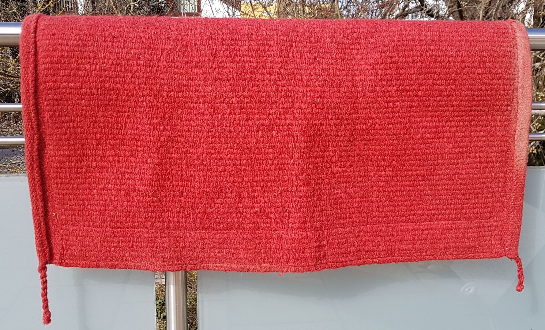 Show Western Blanket 90x90 wool used - Offer here a rarely used Western Blanket made of wool. The blanket was only used with underlay, has a beautiful warm red colour and is optically set off at the bottom with a (leather?) decorative border.