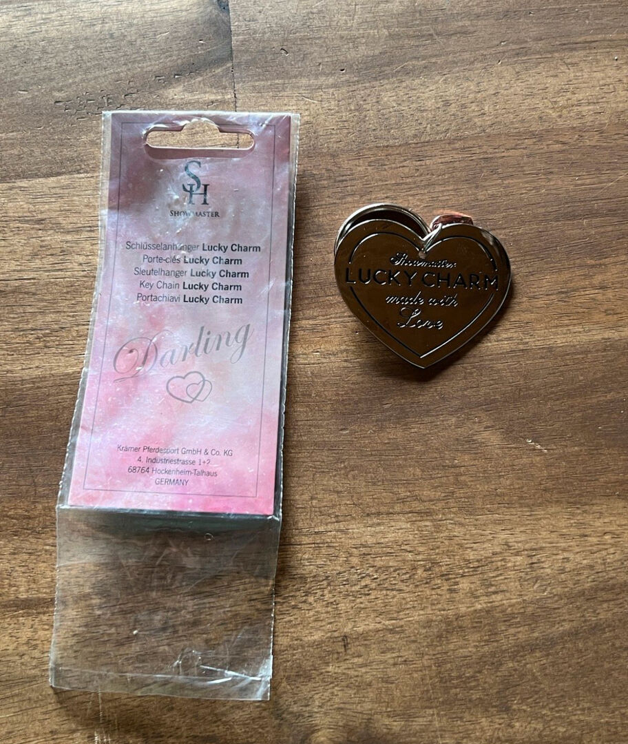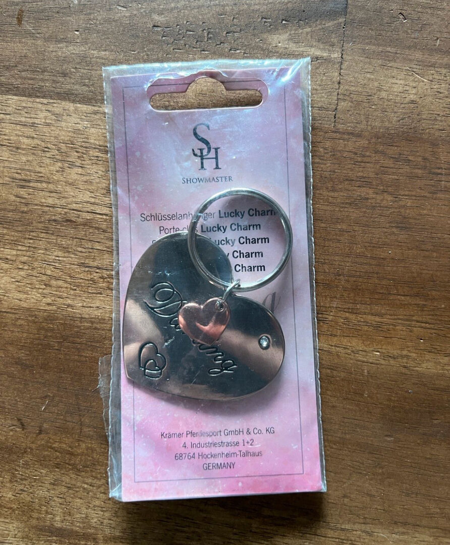 Showmaster Lucky Charm Keychain - Sell a new keychain from Showmaster. This is a Lucky Charm, it has a small glitter stone and another small additional heart. Description from Krämer: Lucky charm pendant in heart shape for the keychain with ring. Stainless.