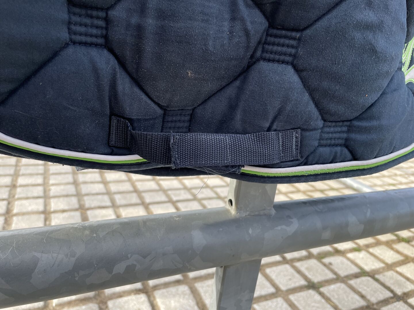 Showmaster Saddle Pad Blue Polo Society in VS - Sporty cut saddle pad. Polo Society" lettering on both sides. Saddle and girth loops with practical Velcro fastening. Underside made of breathable and moisture-absorbing Air Mesh material. Outside 100% cotton, padding and underside 100% polyester.