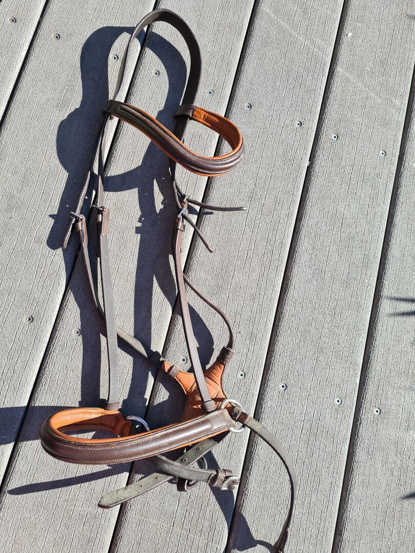 Sidepull Brown - Sidepull made of brown leather. Cognac colored lining. Was bought used by ourselves, so no information on age and manufacturer. Unfortunately does not fit our 180 warmblood with large head. Rather for smaller heads. Evtl also rather thoroughbred. Leather is still nice and supple. Private sale. No guarantee and no return