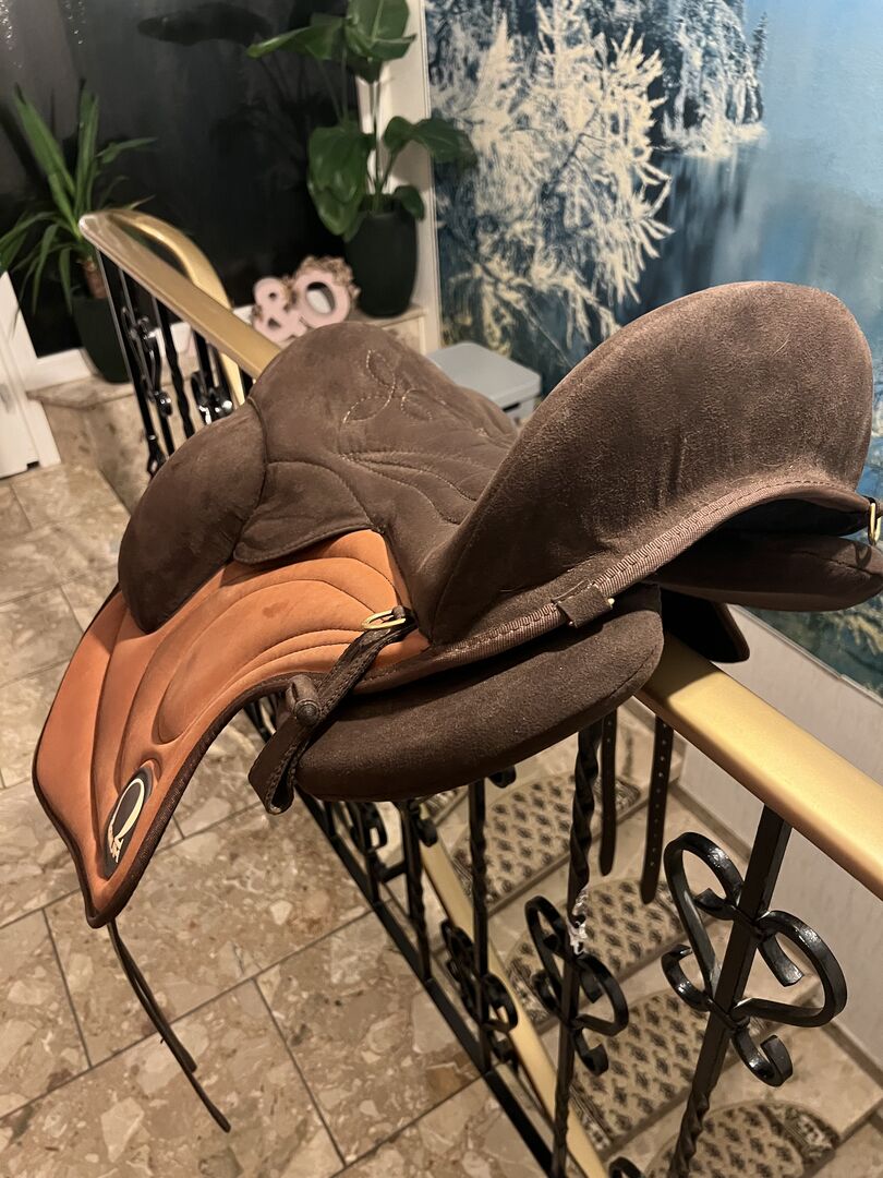 Color: Chocolate (vegan suede type) and cognac smooth leather Fittings: Brass With stirrup attachment Vegan girth straps - particularly hard-wearing