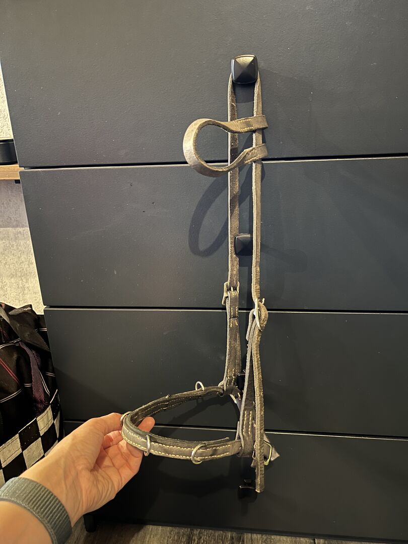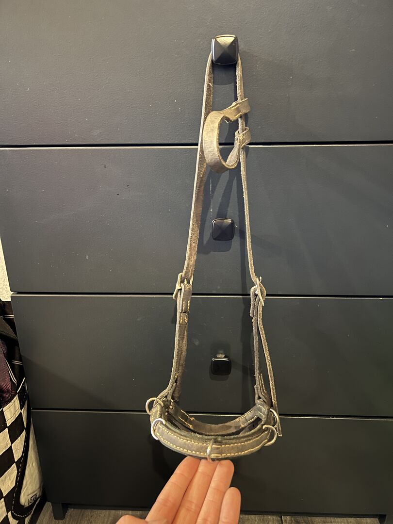 Single ear snaffle with cavesson function Full-XFull/WB-KB gray - For sale here a used but very well preserved bridle made of gray oiled leather with cavesson function in size WB-KB. The leather is very soft and the bridle is easy to adjust and can therefore be optimally adapted to many heads. I had it on a 1.72m tall Friesian who always needs a KB bridle. I had placed it quite centrally, so there is still room at the top and bottom. You can also use the bridle completely as a cavesson and unbuckle the cheek pieces for the bit. The cavesson is lined with dark green leather.