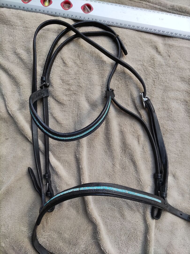 Snaffle Iceland snaffle turquoise glitter size Cob - Sell my beautiful turquoise Iceland snaffle. It is supposed to be a size Cob but runs very large. It has turquoise glitter stones on the browband and noseband. There are a few missing on the noseband unfortunately. Headpiece and noseband with headpiece are separated typical Icelandic.