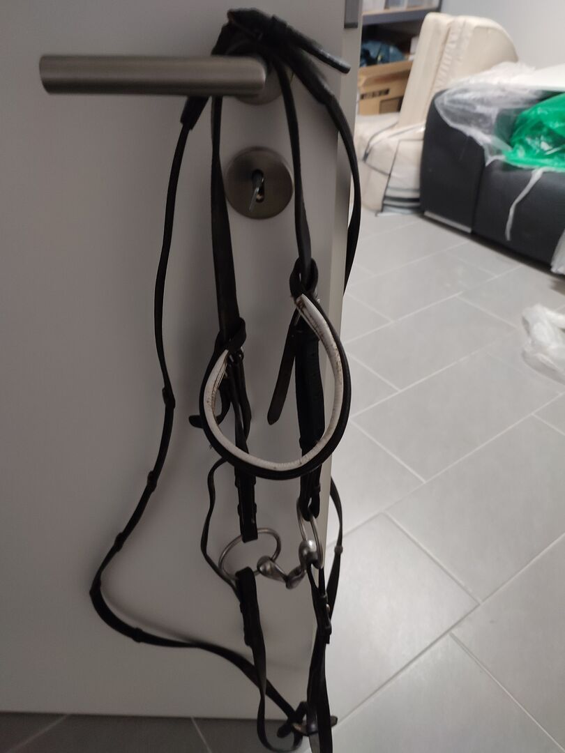 Snaffle with bit and extra browband pony - Black snaffle with bit and extra browband for ponies. The bit is double broken and has a size of 14.5cm. To the snaffle there are two brow straps, in white/black(heavily used) and one in light blue with glitter stones (little used). The reins are 148 cm long and used. At the top of the closure strongly used (see picture)