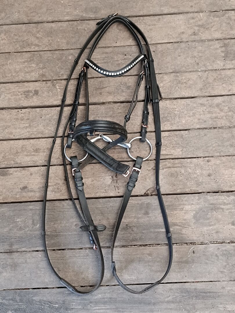 Snaffle without bit, with browband and reins - Snaffle Leather Black Browband with rhinestones Double broken water snaffle Cob Locking strap available Will be cleaned before shipping