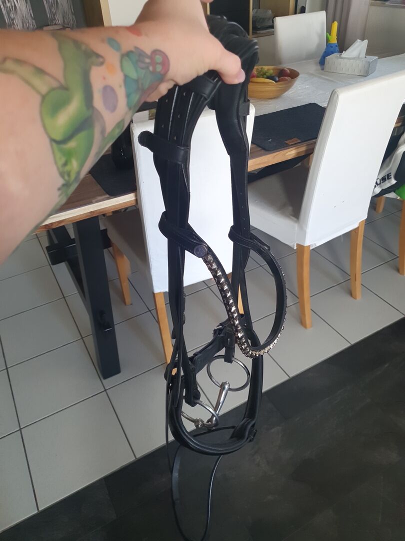 Snaffle X-Full/Warmblood Plus Bridlery anatomical headpiece - I am offering a bridle from Bridlery that has only been used a maximum of 5 times. I put it together myself in the designer. Size cold blood Anatomical headpiece and buckles Browband- Stunning Black, very easy to replace with Switch it System Noseband- Swedish buckle- Lacquer Locking strap- removable without residue Ultra soft reins If you are interested, you can take a closer look at the bridle/description at Bridlery or on YouTube. Why are we selling the bridle again? Because we switched to bitless and my little buffalo didn't feel so comfortable with it. Shipping plus shipping costs