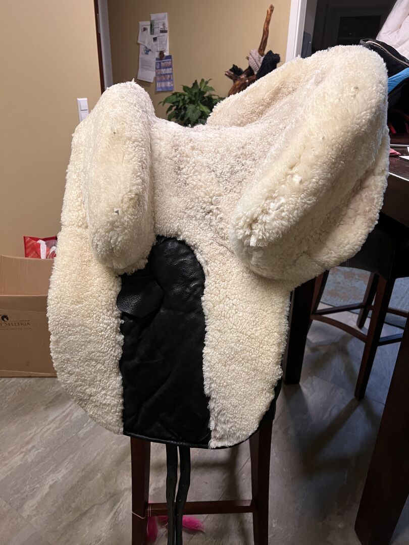 Spanish saddle dressage/working equitation - With lambskin cover. Cozy in winter. For dressage/cross-country or trail riding. Fitted on a Shagya Arabian and a PRE mare. Wool lining made from horsehair. Adapts perfectly to the back due to body heat. My RB fits well in the saddle with fur at 65 kg.