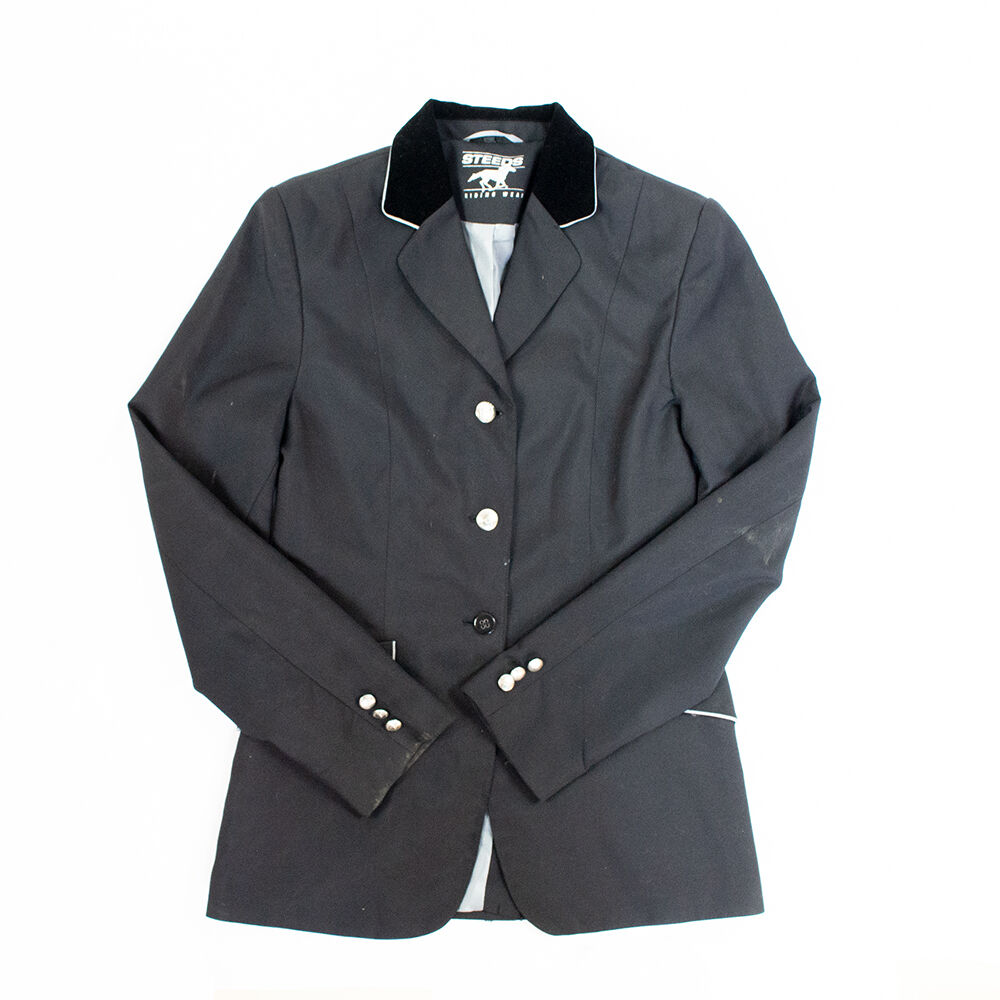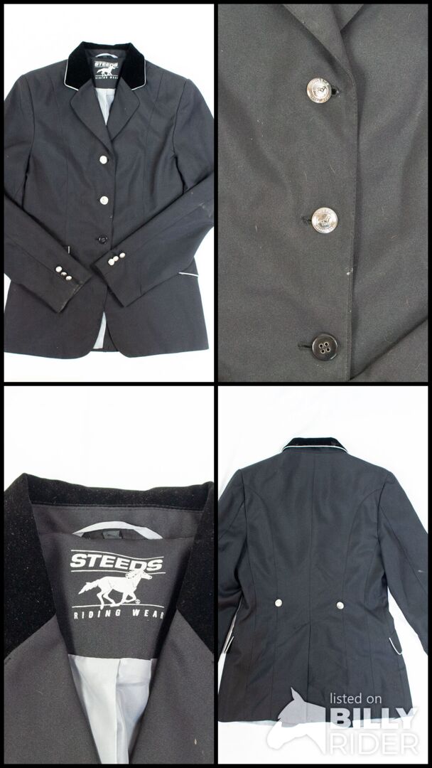 Steeds Ladies Tournament Jacket Anthracite 80 - The great Steeds tournament jacket is the perfect companion in any test. The gray jacket has two pockets on the front, which are set off with a silver piping and size 80. Size 80 is a long size that turns out like 40 but has longer arms. The stretchy material fits perfectly to the body and allows absolute freedom of movement. The jacket has a velvet collar in black, which is also set off with a silver piping. It is washable at 30 ° C and is made of 100% polyester. It has traces of use. To the seller's offerlaunch