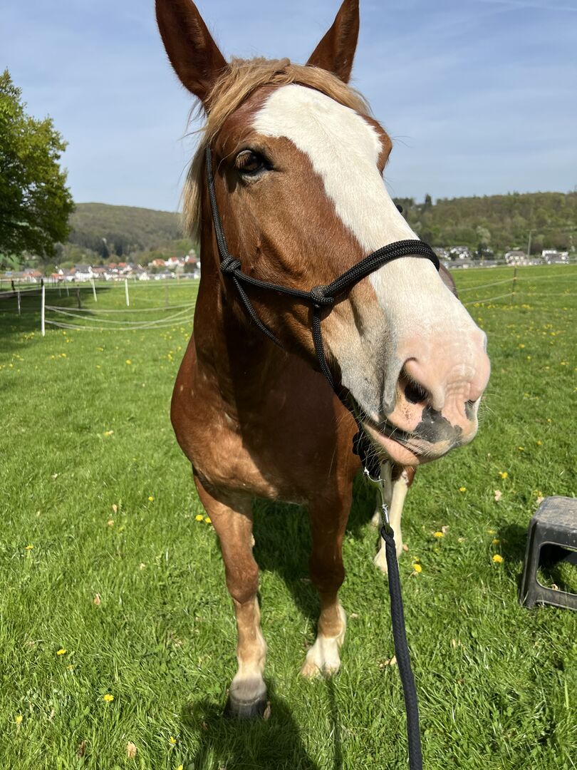 Strong, beautiful warmblood mare - Location: 65529 Waldems Elli is a strong Polish warmblood mare of heavy type. She stands out not only because of her strong build, but also because of her great color (red roan) and her bright mane/tail. She also scores points with her very kind nature. The mare was born in 2018 and is 155 cm tall. Due to her strong build, she also covers taller/heavier riders well. Elli is people-oriented, well-behaved, curious, very willing to learn and accessible. The mare wants to be challenged and is eager to do everything right. She is very balanced when exercised regularly. Elli is unspent, as she was only broken in at the age of 5. Suitable for all disciplines: Trail riding, leisure, western, jumping, dressage, carriage driving. She is broken in the basic gaits. Goes out on her own and in a group. Knows ground work, lunging, work in the arena, calmness training, walks etc. Due to the owner's personal circumstances, Elli has had a break and needs to be trained again. She is therefore being sold as "raw" far below her value. Elli is available for viewing, but please refrain from test riding to protect the horse. A great horse for someone who likes to be versatile and enjoys training horses. Place before price.