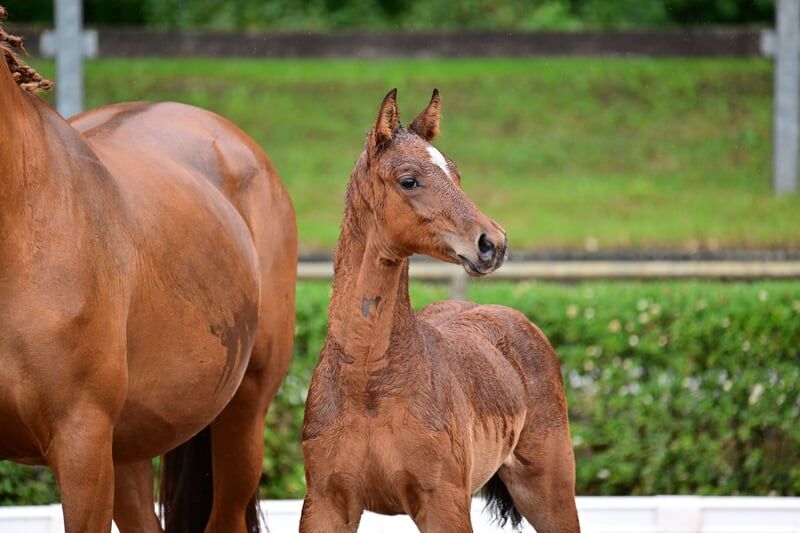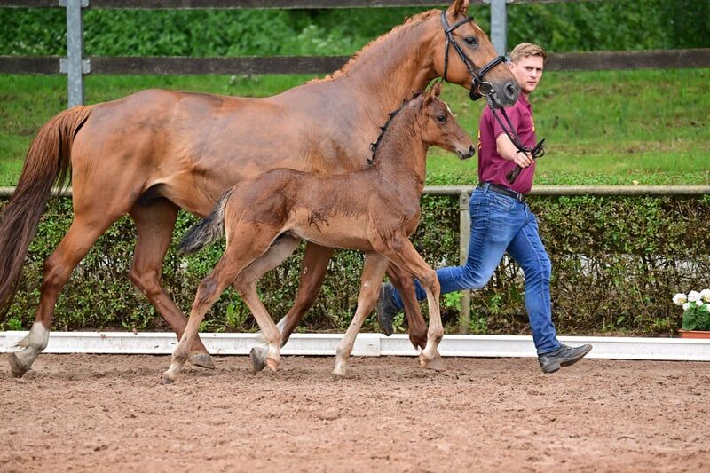 Strong moving stallion by a top sire - Location: 39517 Burgstall Charly - this beautiful, strong-moving German sport horse stallion, born on 04.2024, impresses with his elegant appearance in the color brown and reaches an expected final height of approx. 168 cm. A real eye-catcher with his typey appearance and correct conformation. Charly will grow up in a herd, will be wormed and already knows the farrier and vet. He has a lively, people-oriented character and is curious and always trusting. He already knows the foal ABC and walks relaxed on the halter next to his mother. Charly's sire is Cape Calidus (winner of the stallion performance test in Adelheitsdorf 2022) His dam is a daughter of Chap I. (sire of the European Champion DSP Chakaria). A full brother of this foal's dam was S-winning in Balve and Hamburg in the small derby. Thanks to his promising jumping pedigree, with a sire who has been shown successfully, Charly is a great young horse for the jumping classes and a promising partner for the sport.