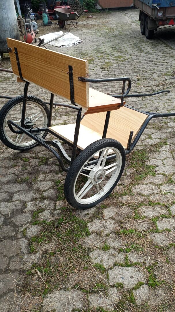 The gig is made of sturdy metal tubing and robustly welded (no thin cheap hollow tubes that quickly kink or bend). The entrance is deep without trip hazards, so that can be quickly mounted and dismounted (super e.g. with handicaps of the people or when breaking in young horses). The rims and tires are equally robust.