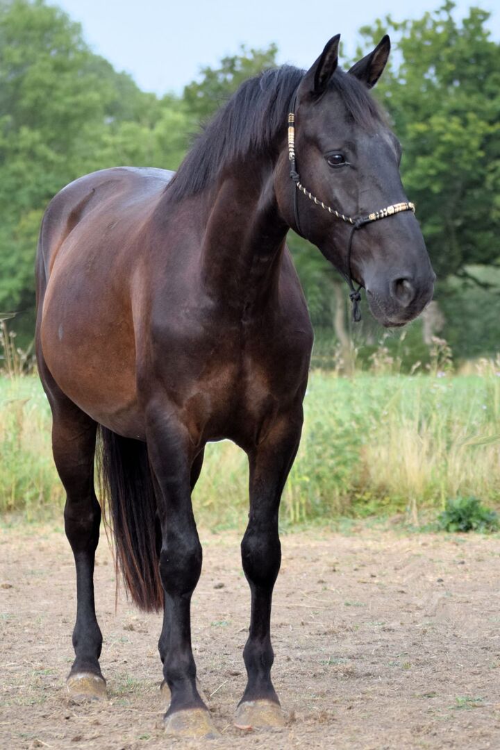 super well behaved, hardworking riding pony gelding - This picture perfect Friesian type riding pony gelding is looking for a new 5 star home. He was born in 2019 and has a height of 147 cm. The gelding has a very stable foundation but is still elegant under the rider. He has a very sweet character, is very well-behaved and well-behaved in handling and under saddle. Therefore also well suitable for beginners. A good clinical AKU is already available. He can be ridden in many different ways. Classically as well as Western. He runs along very nicely in lessons. In the terrain he just brings fun and is quite reliable there. He also masters a small jump without any problems. He has also been allowed to participate in horse shows. All around just a great pony, which is versatile. Is only given away because the current rider has become too big for him.