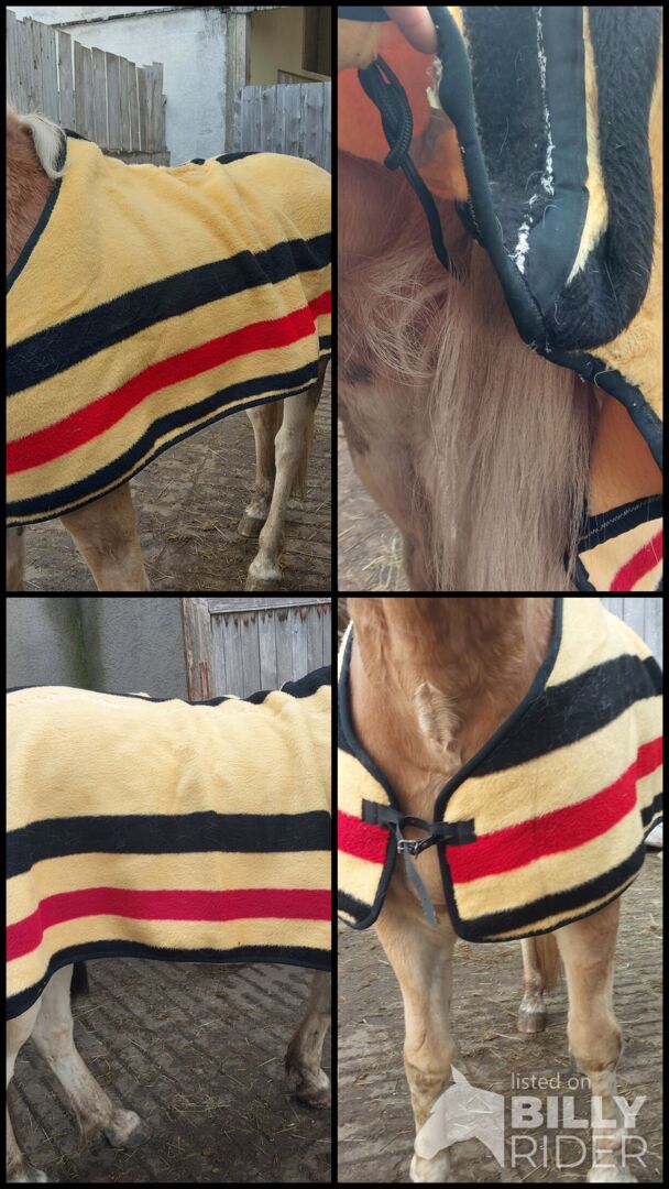 Sweat blanket 155 - A high-quality sweat rug with particularly thick fleece is for sale - ideal for the colder seasons and perfect for sweating off after training. The rug impresses with its cuddly soft, warming material, which reliably absorbs moisture and at the same time makes it comfortable to wear. Details: 🐴 Sweat rug made from thick, fluffy fleece 🔥 Warming & breathable - perfect after riding 🎨 Classic design in cream with black and red stripes 🧵 Cleanly finished and hard-wearing 🔒 With fastener for a secure fit Condition: โ New Ideal for stabling, training or transportation - a reliable rug for your horse 📦 Shipping possible 💬 Please contact us if you have any questions