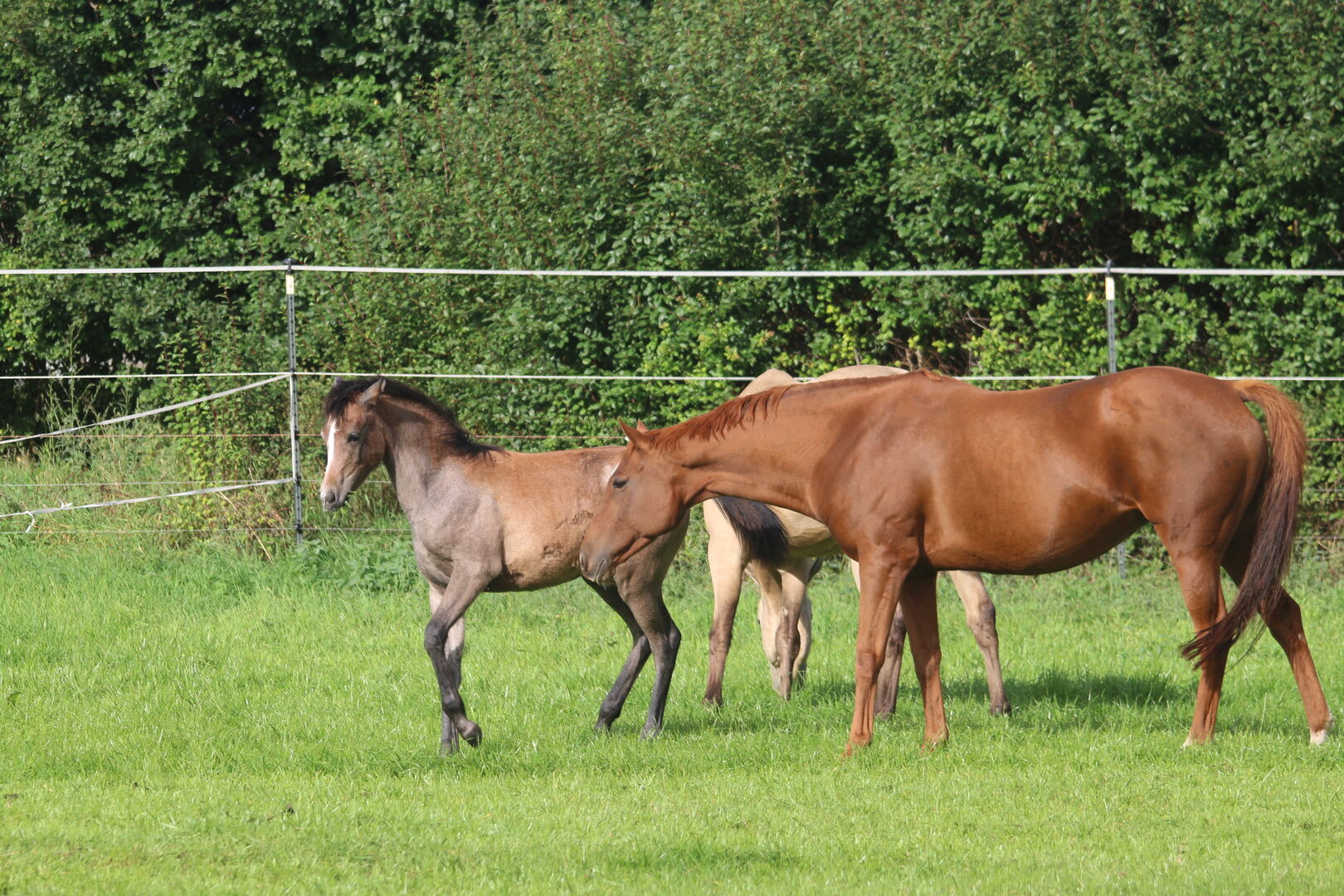 Eleya grows up in the herd, is already halter trained, gives good hooves, can be groomed, tied and loaded impeccably. She knows machines and other animals (dogs, chickens,...) and is always curious and open-minded.