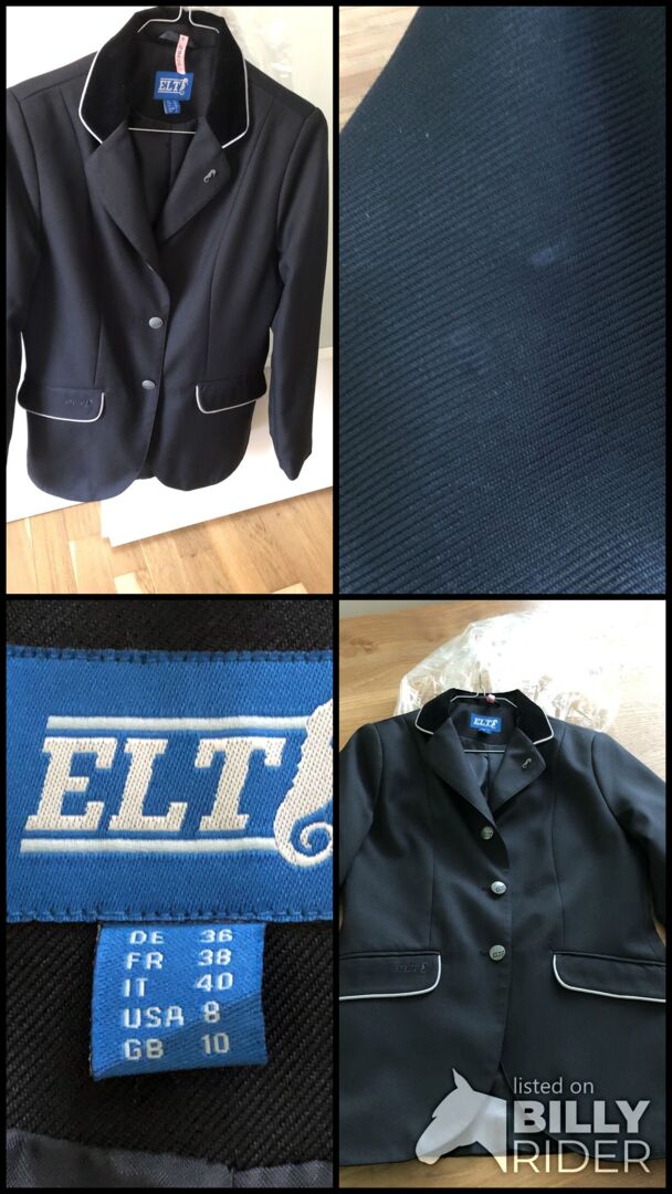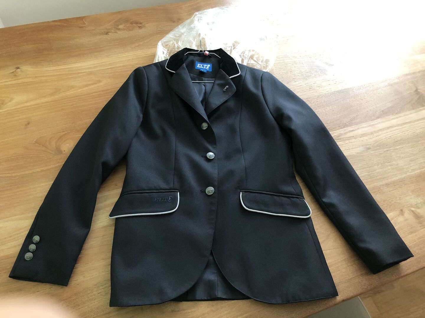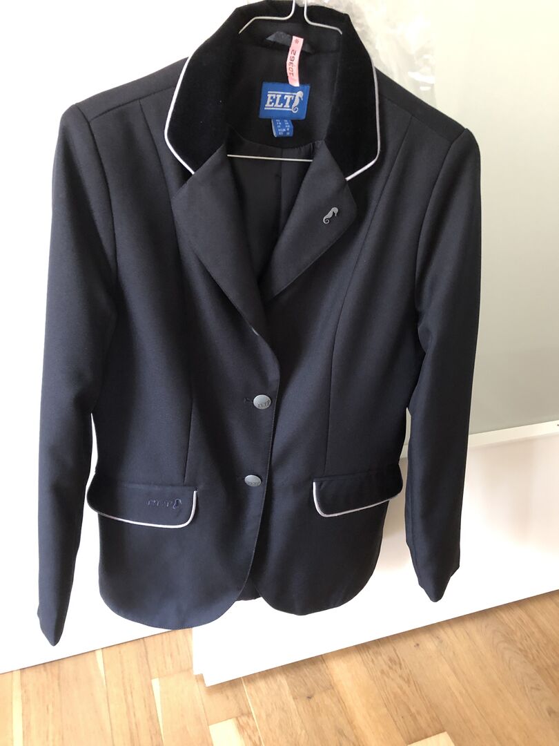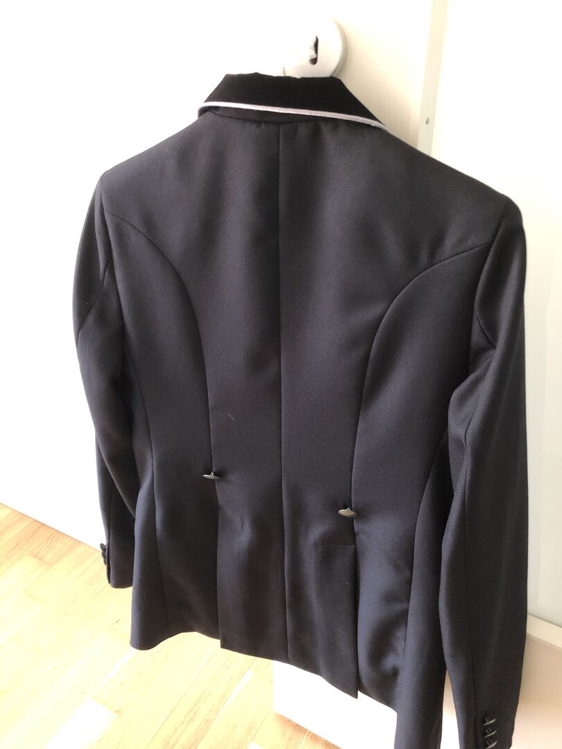 Tournament Jacket / Tournament Jacket Black S - Sell black, elegant tournament jacket in size 36, it has a velvet collar and contrasting colour pocket flaps (silver). The slightly waisted cut and the two back slits make it comfortable to wear. On the right upper arm the jacket has a small colour fault (see photo) - but it is not noticeable when worn! It was only worn for one test and comes fresh from the cleaners. It can be shipped on request, but would have to be folded. The cost is 5 Euro. We are a non-smoking household!