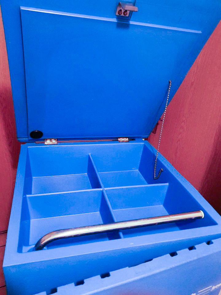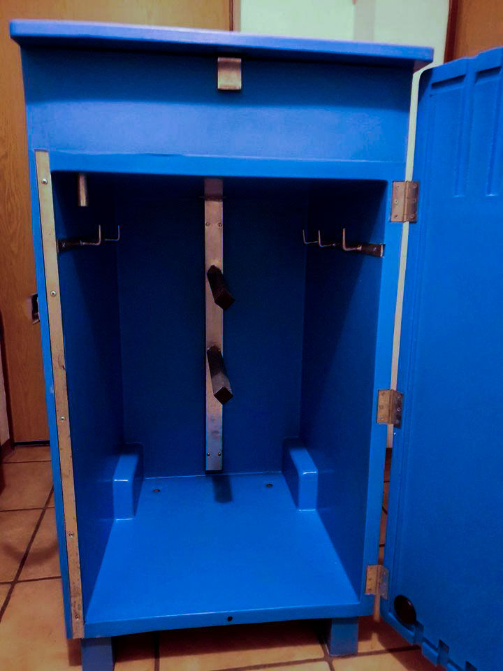 The show locker has 2 fixed saddle holders. several bridle holders, is lockable by means of a lock, has a hinged top with many compartments for odds and ends and a swiveling 3rd saddle holder.