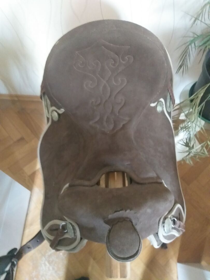 Treeless Western Saddle - Since we have changed to fur saddles, we offer here a used but well preserved treeless western saddle. It was on a broadly built Arabian mare with low backbone. With the purchase of the horse we have taken over the saddle with. Because of this kind of suede cover it is very easy to care for and can be brushed for cleaning. It has a chamber width of 20 and a seat of 17 inches. Shipping can be made for an extra charge. Price is negotiable