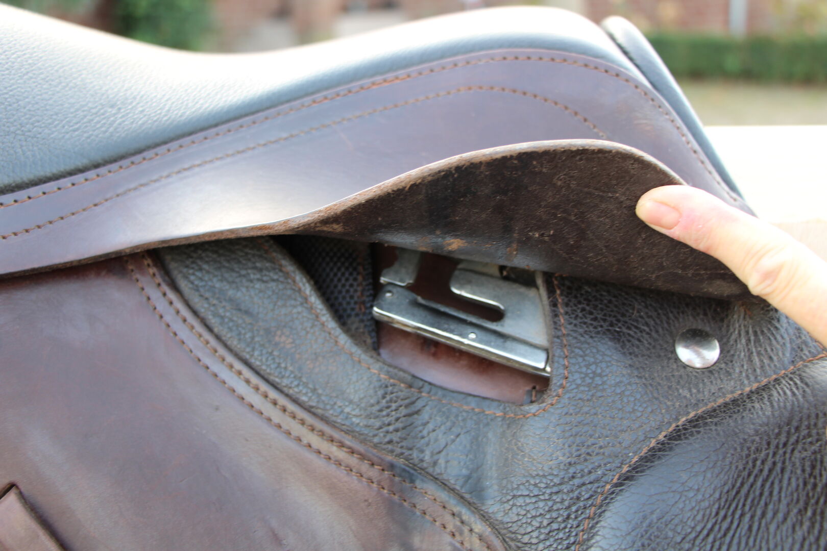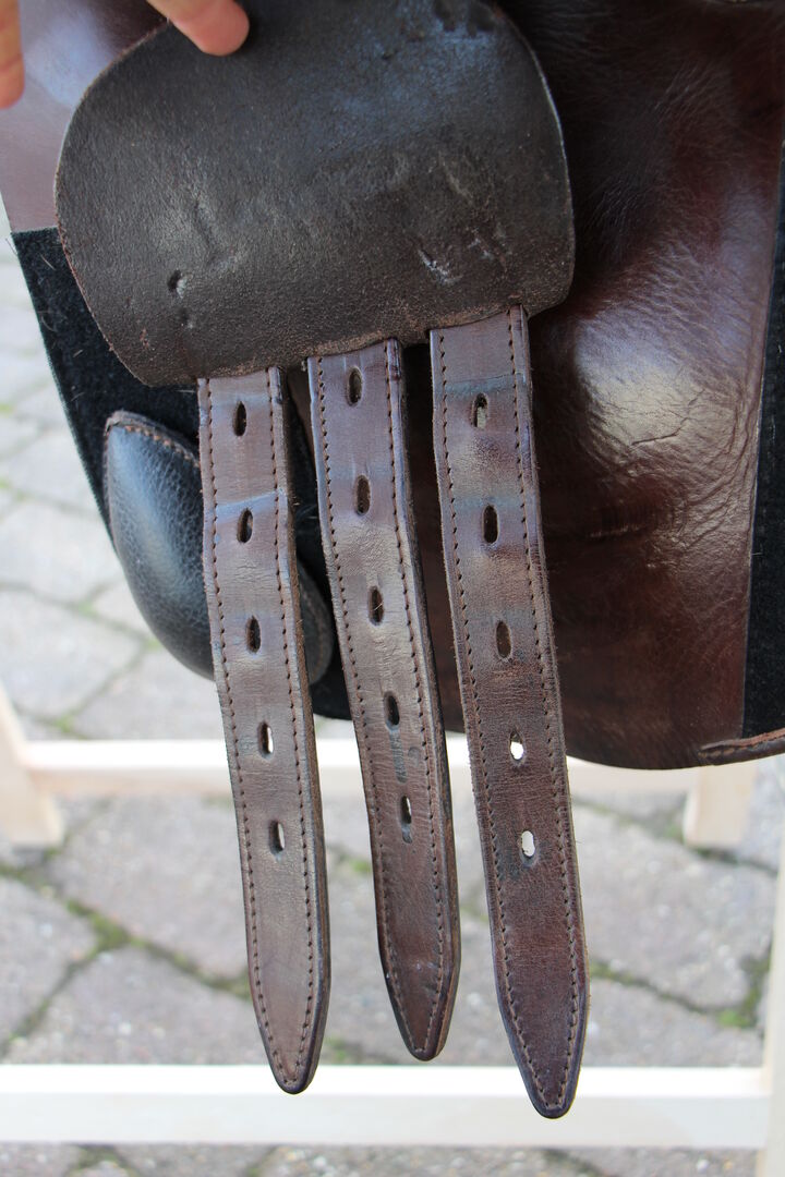 TREKKER leather tree saddle VS - brown and black leather, relatively short saddle, with Velcro pads front and back, including stirrup leathers, very comfortable to sit, I bought it used myself, therefore no size indication, estimate 15/16 " Condition: used, leather well cared for but with scratches, stirrup bars intact Private sale, therefore no return or warranty