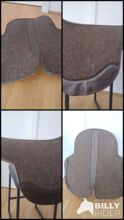 Ideal for long trail rides: High-quality, shock-absorbing and, thanks to natural fibers, particularly breathable pad made of wool felt with underside made of soft merino wool and protective leather trimmings in the girth area and along the back line. The anatomical shape with a recess in the withers area protects against chafing. The cut-out at the back reduces the area covered by the pad and thus enables healthy perspiration. Suitable for Endurance saddles without panels (contact surface like Western saddles). Length 62 cm, depth 48 cm, thickness approx. 2.9 cm. 100 % wool felt.